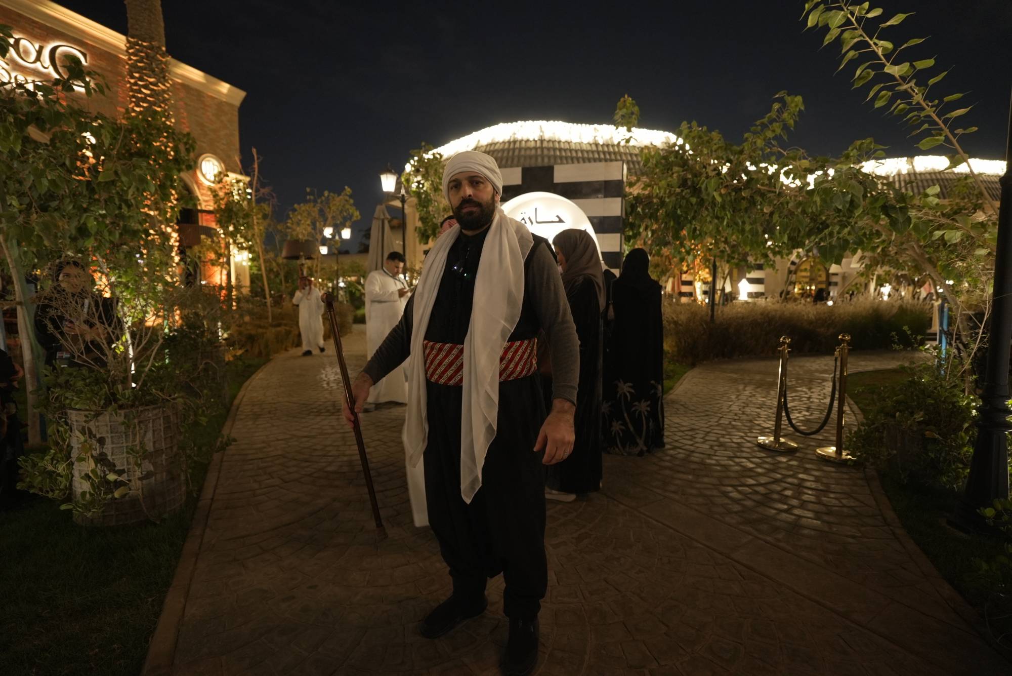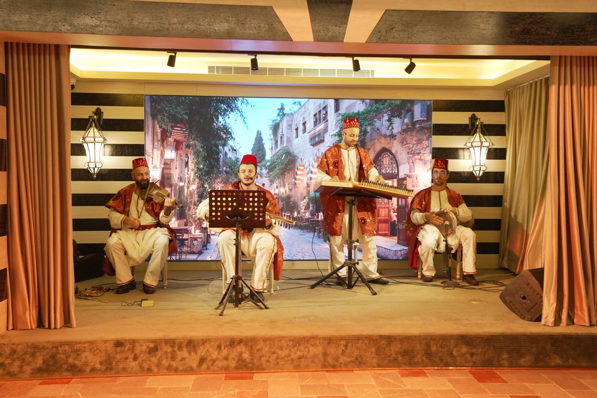 ويمتدّ حضور هذا التراث إلى أداء العاملين الذين يرتدون الملابس العربية المُستلهمة من شخصيات «باب الحارة»، بما في ذلك العباءات والطربوش الدمشقي والإكسسوارات التقليدية التي تُجسّد صورة «الحارة»، كما عرفها جمهور المسلسلات السورية. ويعيش الزوار أمسية احتفالية تتداخل فيها العروض الموسيقية الشرقية من عزف العود والقانون، إلى جانب الدبكة الشامية على غرار الأعراس والمناسبات الشعبية.