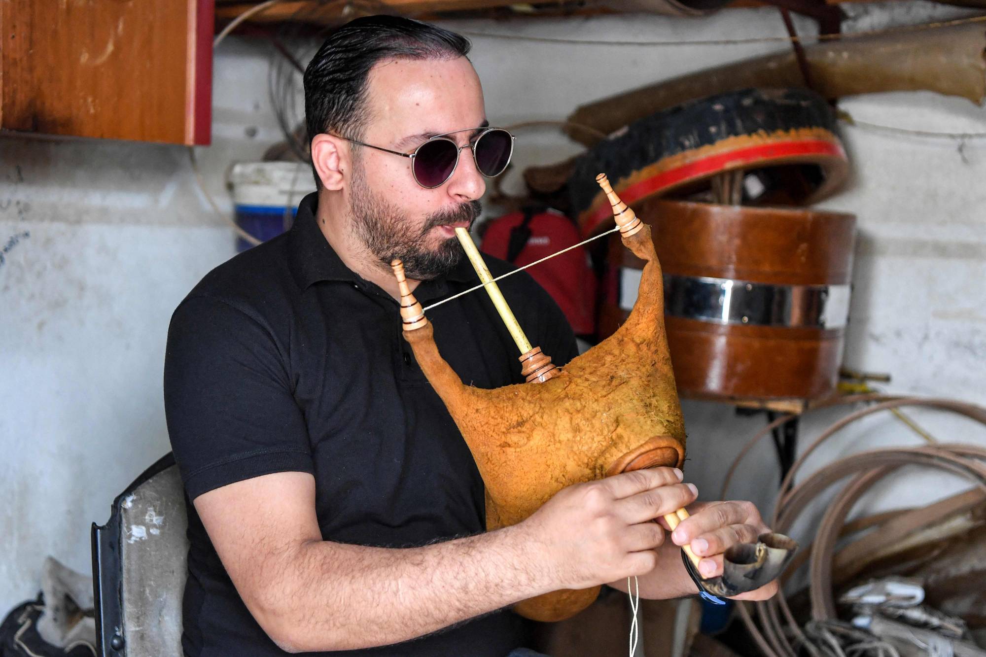 الموسيقي التونسي منتصر الجبالي يختبر آلة «المزود» (أ.ف.ب)