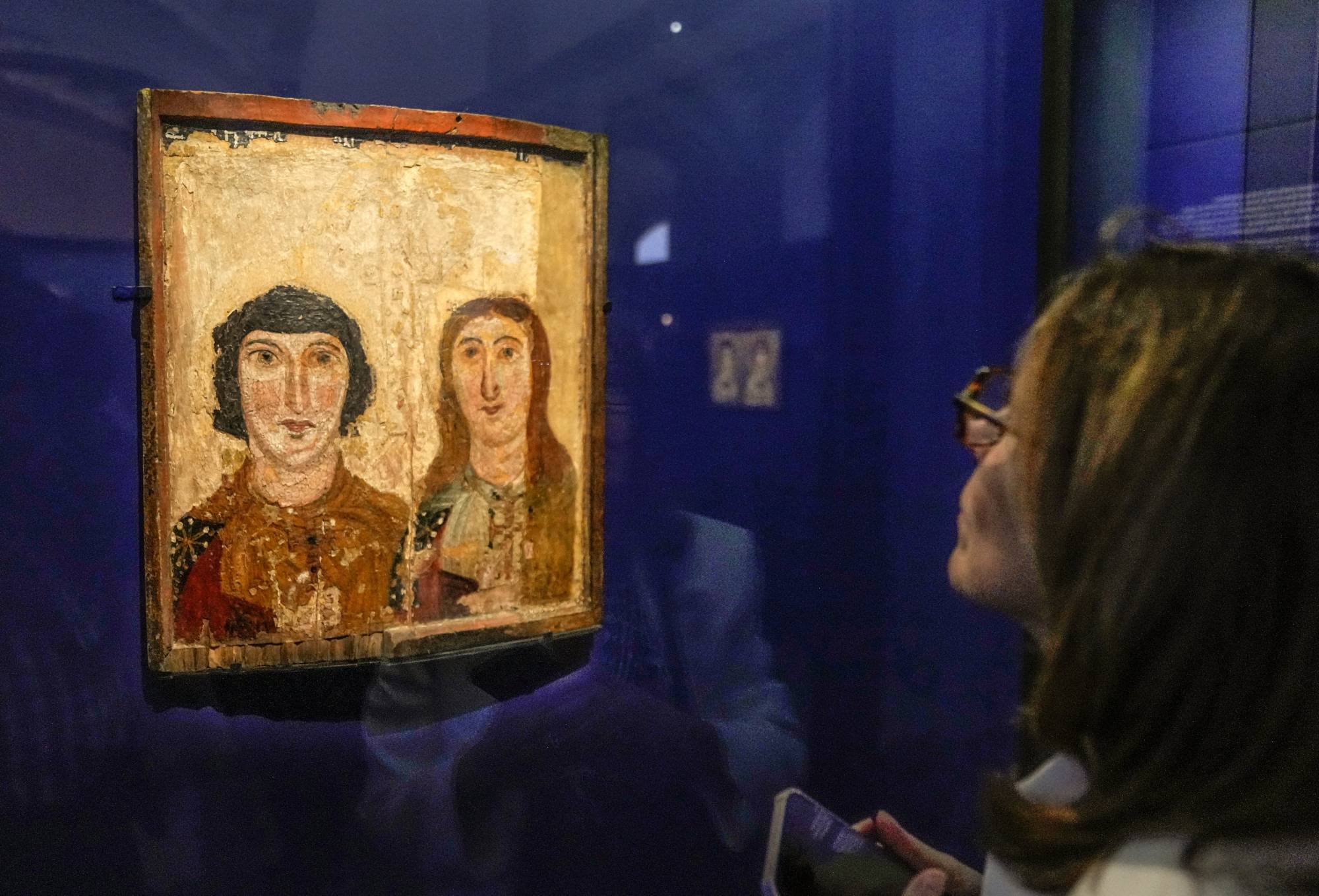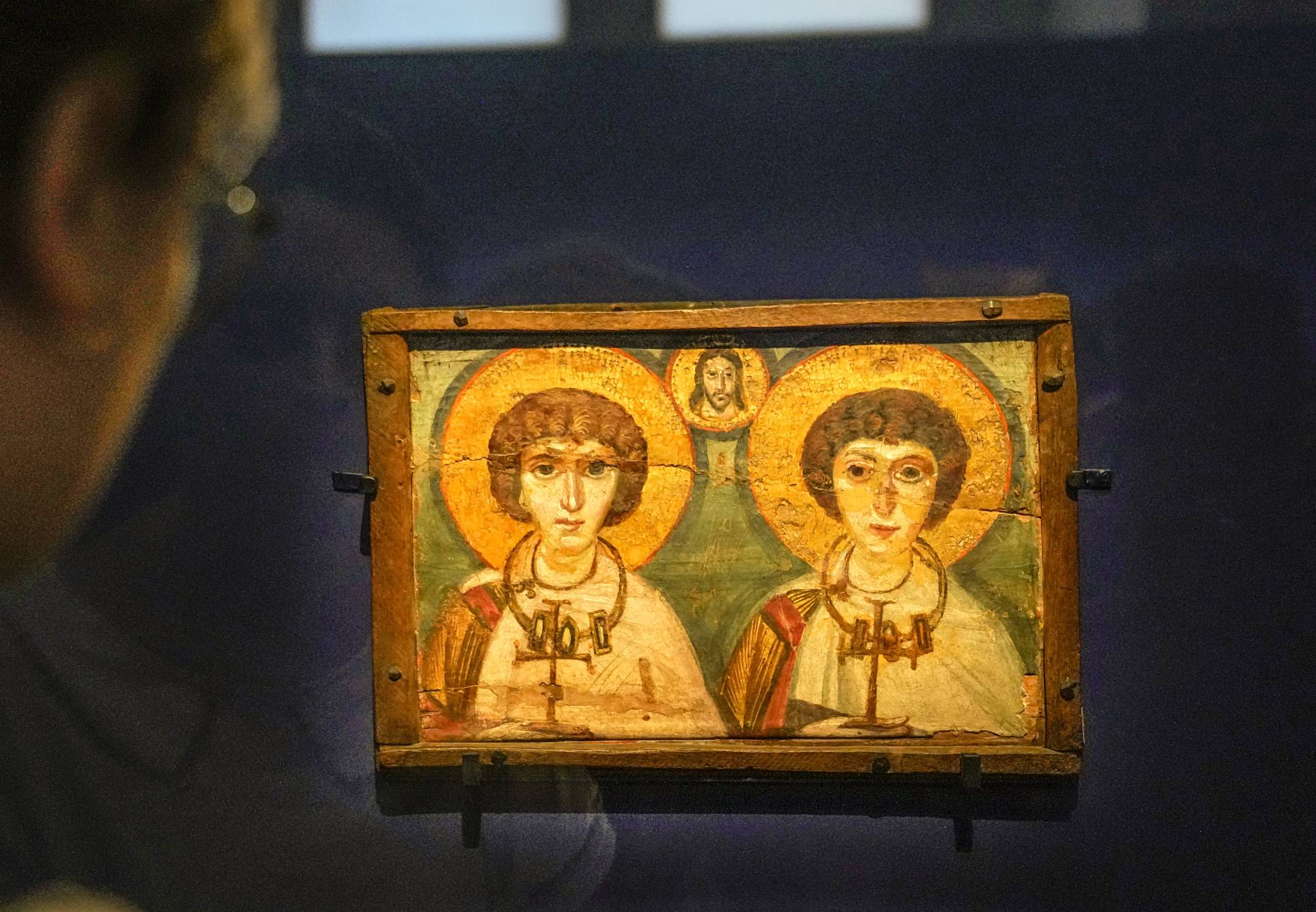 أيقونة القديسين أفلاطون وغليسيريا (القرن 6- 7 ميلادي) من دير سانت كاترين في جبل سيناء بمصر ومتحف خانينكو بكييف... معروضة الثلاثاء 13 يونيو في يوم للصحافة بمتحف «اللوفر» بباريس (أ.ب)