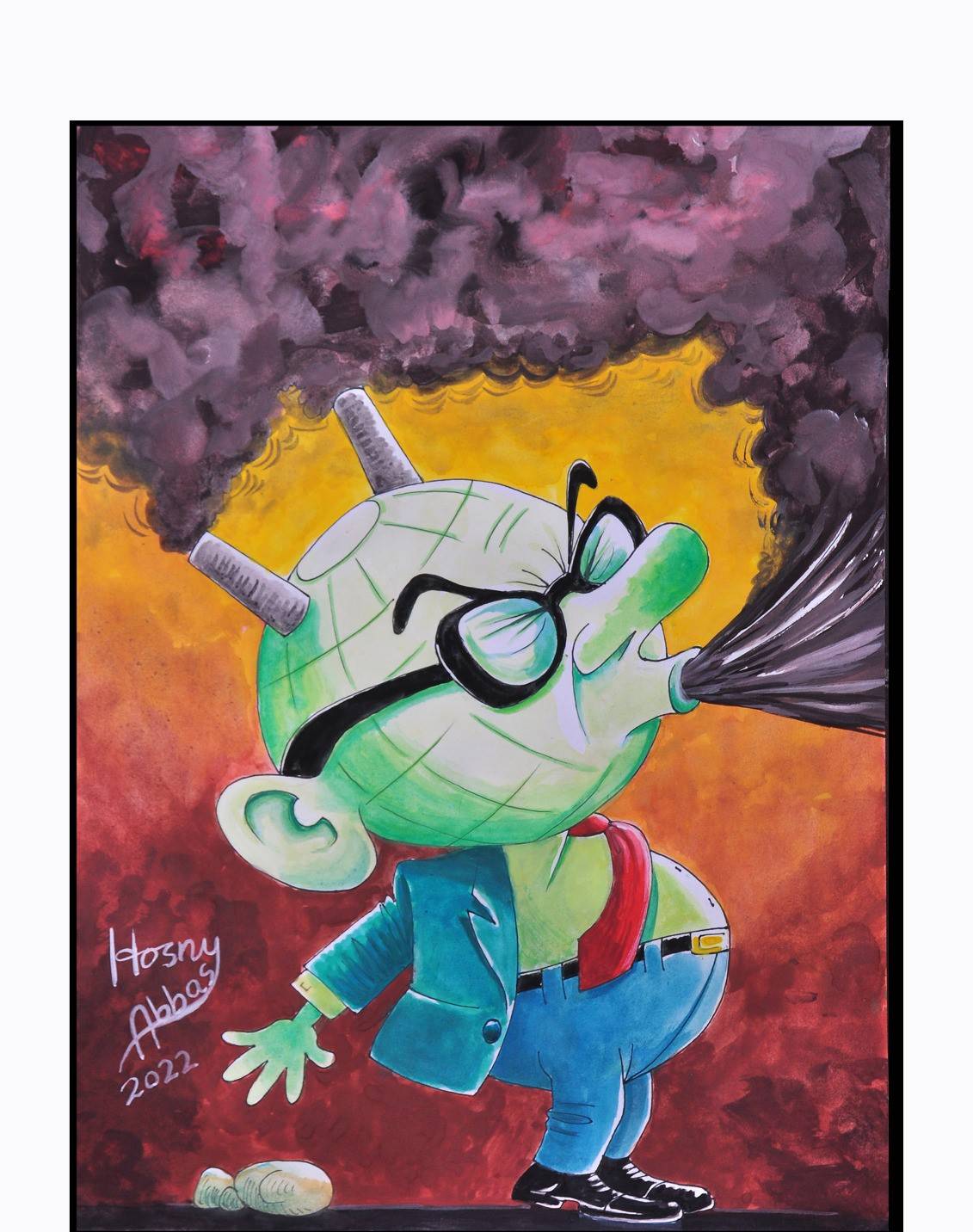ويقدّم الفنان المصري حسني عباس الأرض في صورة فانتازية وكأنها إنسان ينفث الدخان والحريق من فمه بعد أن تسبّبت في اختناقه.