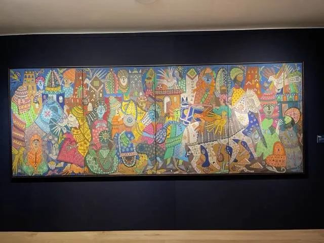 في قاعة صغيرة في الطابق الأول يلقي لنا المعرض طعماً ليجذبنا لمشاهدة المجموعة كلها. تفاجئنا لوحة ضخمة تحتل جداراً بأكمله، تحفل بأبطال الأساطير والحكايات الشعبية، تداعب ذكريات الطفولة لدينا وتشغل البصر بألوانها الحية والحركة المنبثقة منها، اللوحة للفنانة المغربية فاطمة حسن الفروج بعنوان «يوم العيد». على الجدار المقابل لوحة تحمل من عناصر الثقافة الشعبية الكثير، هنا الطفل الذي يصعد على سلم للسماء ليمتطي سحابة بيضاء لتحمله للقمر، يبدو في اللوحة تأثير من الفنان الروسي مارك شاغال، ولكن بلمسة عربية أصيلة، هي للفنان اللبناني عبد الحميد بعلبكي وتحمل اسم «حلم الطفولة»... وما أبدعه من حلم!