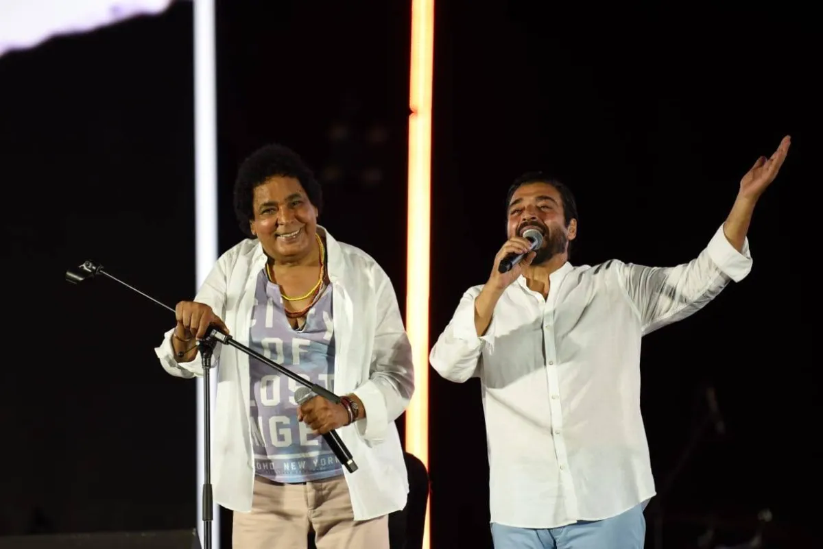 محمد منير وحميد الشاعري خلال أدائهما أغنية «أكيد» (صفحة المهرجان في «فيسبوك»)