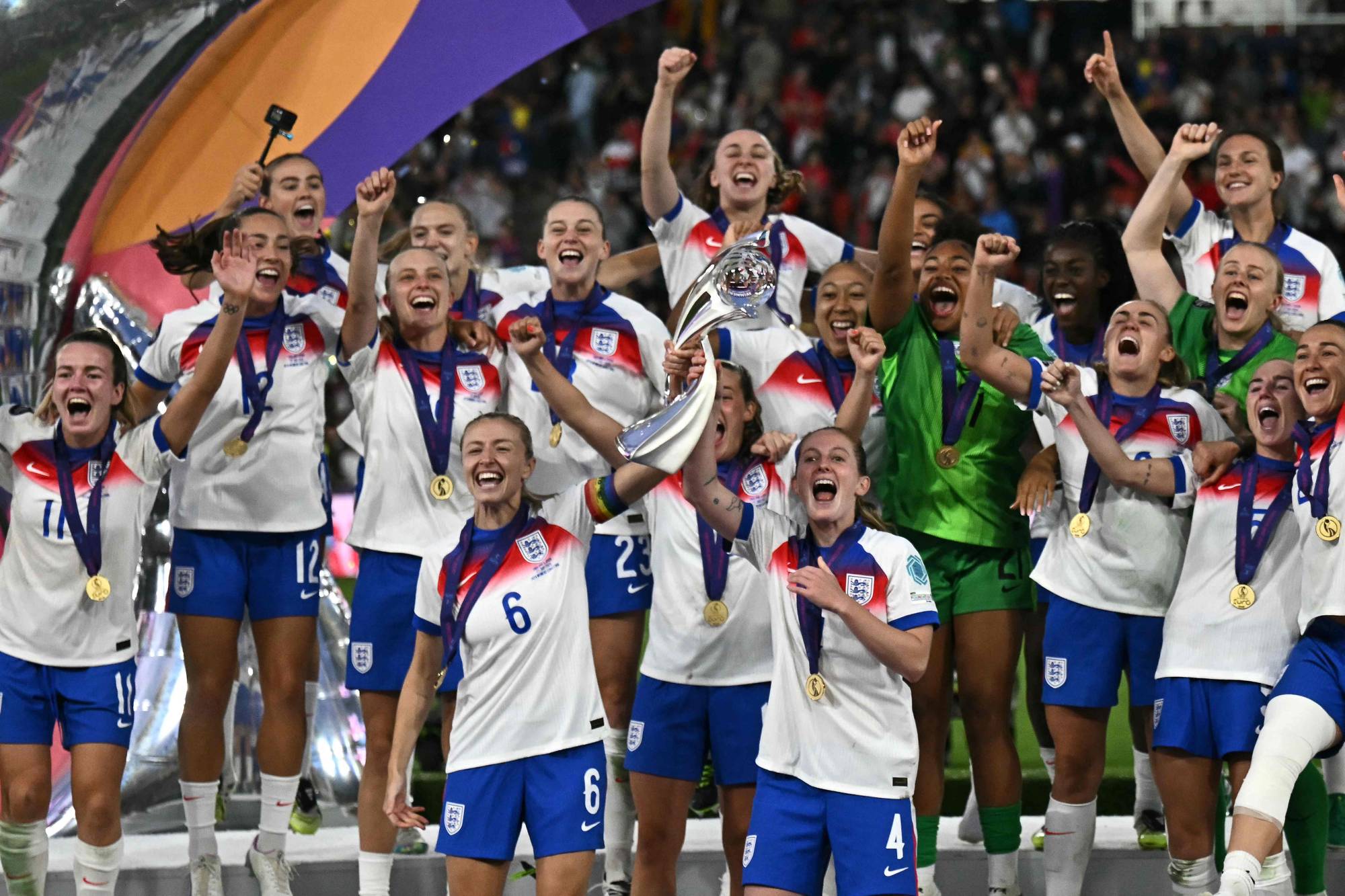 رفعت المدافعة الإنجليزية رقم 6 ليا ويليامسون (CL) ولاعبة خط الوسط الإنجليزية رقم 4 كيرا والش (CR) الكأس احتفالاً بفوز إنجلترا في المباراة النهائية لبطولة أمم أوروبا للسيدات 2025 بين إنجلترا وإسبانيا (أ.ف.ب)