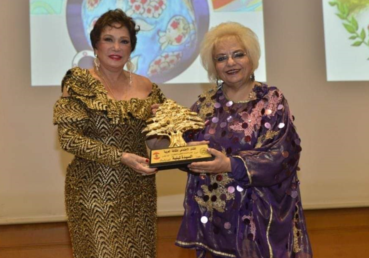 لبلبة وهي تتسلم جائزة تكريمها من رئيسة المنتدى آسيا قاسم (حسابها على «فيسبوك»)