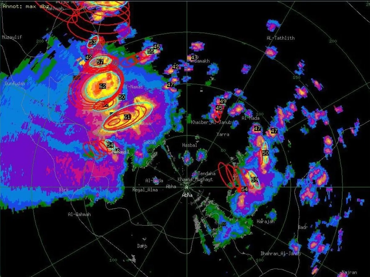رادارات الطقس توضح استمرار هطول الأمطار على عسير والباحة ومكة المكرمة (المركز السعودي للأرصاد)