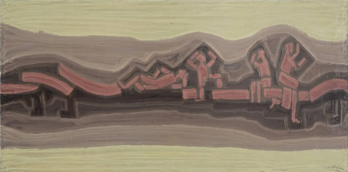 من الأعمال المعروضة عمل للفنان الرائد محمد السليم المعروف بتطويره مذهب «الآفاقية» في الفن السعودي الذي تميز بخطوطه السائرة من اليمين لليسار وبالتدرجات اللونية لأفق الصحراء، في لوحات السليم (ولوحته هنا مثال) تلعب الصحراء الدور الأساسي فهي الخلفية والموضوع وهي التأثير. تشير روي إلى أن لوحة السليم من اللوحات المفضلة عندها، تتحدث عن تصوير الفنان لخط الأفق وتأثره بالصحراء وتخلصه من الشكل وأيضاً طريقة تحريره للحروف عبر التجريد والتفكيك، مضيفة: «أراه عملاً مدهشاً!». يبرز في عمل السليم تأثير التراث والبيئة المحلية بقوة، وهو ما يظهر في أعمال الفنانين الآخرين هنا، يشير بيان الدار إلى أن السليم نجح في المزج بين الحديث والتقليدي. تعرض لوحة السليم التي رسمها في عام 1988 بمبلغ تقديري بين 80 ألفاً و129 ألف جنيه إسترليني.