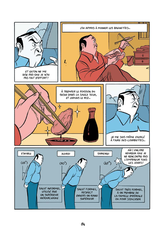 وفي صفحات الكتاب يظهر كارلوس غصن وهو يحاول أن يتأقلم مع العادات اليابانية في تناول «السوشي» بالعصا الخشبية، أو المعاناة من ألم الظهر بسبب كثرة الانحناء عند تبادل التحية. وقد لجأت المؤلفة إلى حيلة للتعليق على بعض أقواله التي يمتدح فيها نفسه؛ فهو عندما يؤكد أنه كان قريباً من مرؤوسيه، تظهر في فضاء الصفحة دائماً شخصية خيالية لتذكيره بأنه لم يرتبط بصداقة مع أي من العاملين معه.