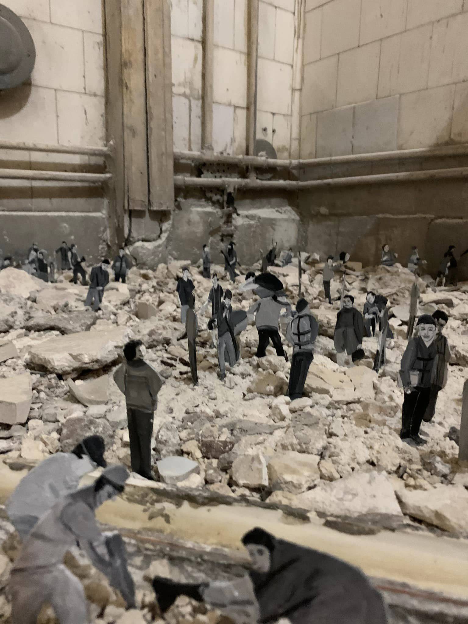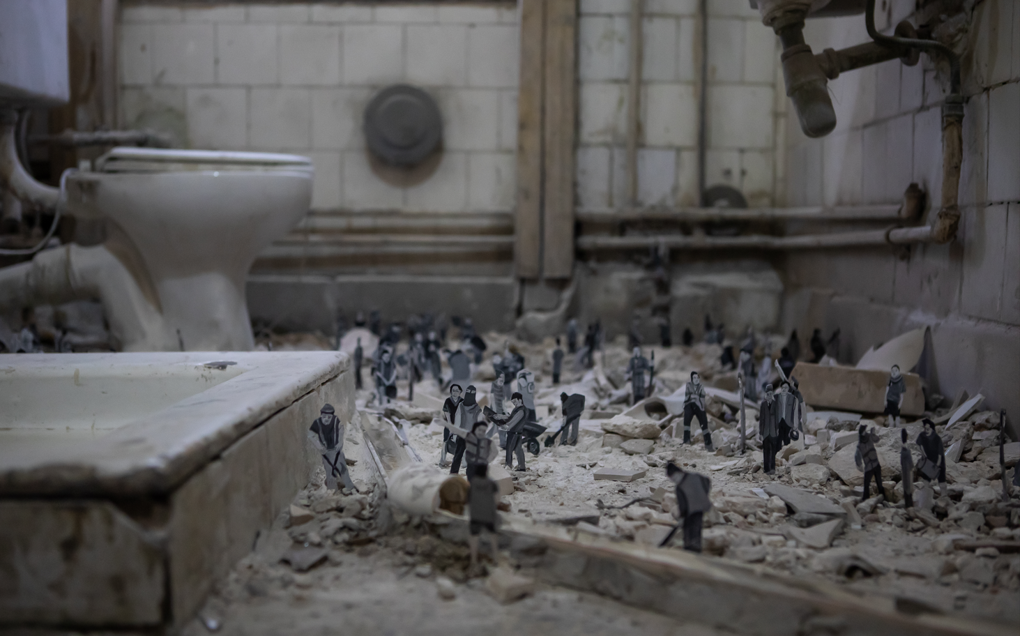 ففي أحد الأعمال، استلهم هاني رشاد مشروعه من صورة في الأرشيف التُقطت في الأربعينات للريّ على ضفاف النهر، فرسم عبر فن «التجهيز في الفراغ»، باستخدام أنابيب حمام البيت المتهالكة، لبناء مشهد مصغّر لموقع ريّ؛ شخصيات على ورق كأنهم عمّال في الموقع، في مشهدية مشابهة لـ«مسرحية لعمّال ريّ يعملون بجوار النهر»، وفق وصف القيّمة الفنية ومنسّقة المعرض فريدة يوسف لـ«الشرق الأوسط».