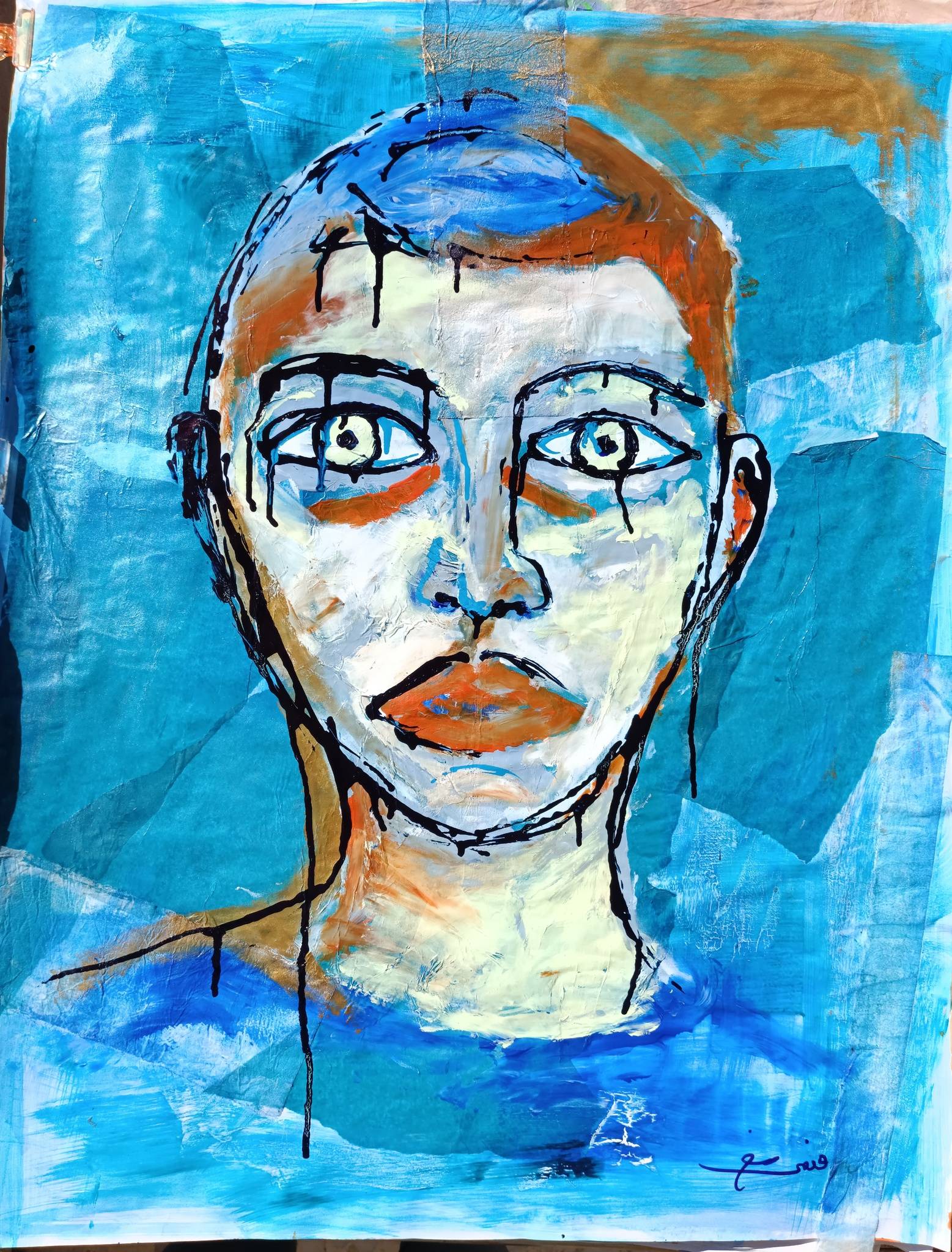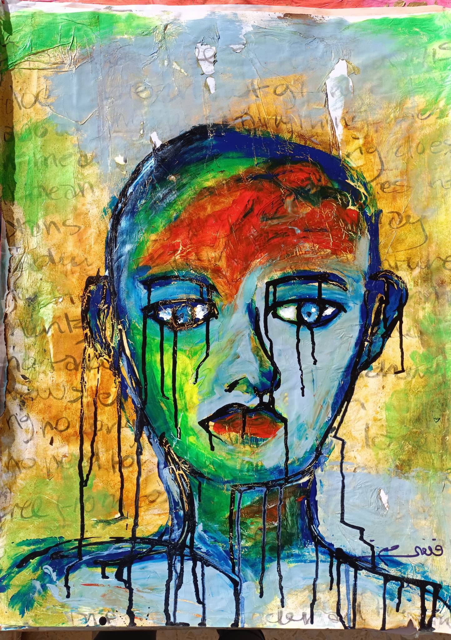 قاسٍ الدمع الأسود المتساقط من الوجه بأكمله، رافضاً اقتصاره على العين؛ شلّاله. هل يشكّل إعلاناً لموت الإنسانية؟ تفضّل إحالة التأويل على المتلقّي: «له أن يرى ما يراه من دون شرحي أو تدخّلي». الشرح والتدخّل يعرّضان اللوحة لهشاشة المعنى وخفوت الوهج. ستتحلّى بكبريائها كلما رآها أحدهم بخصوصية. لذا تقول الرسامة: «التعبير الفني وسيلة فريدة تعكس مشاعر وأفكاراً معقّدة وعميقة من الصعب أو المستحيل وصفها بالكلمات. الفن يتجاوز الحواجز اللغوية. الصور والألوان تنقل معاني مختلفة من دون حاجة إلى اللغة المنطوقة. فالرسم يسمح لصاحبه أن يبوح بخواطره بالاستخدام الإبداعي للصور والرموز. ويمكن للفن أن يسهم في نقل المشاعر بشكل أقوى، متيحاً مساحة للمتلقّي ليضيف إليها رؤيته الشخصية. كما يمكن للفن أن يُدخله إلى عالم الخيال والإبداع؛ ما يوسّع آفاقه».