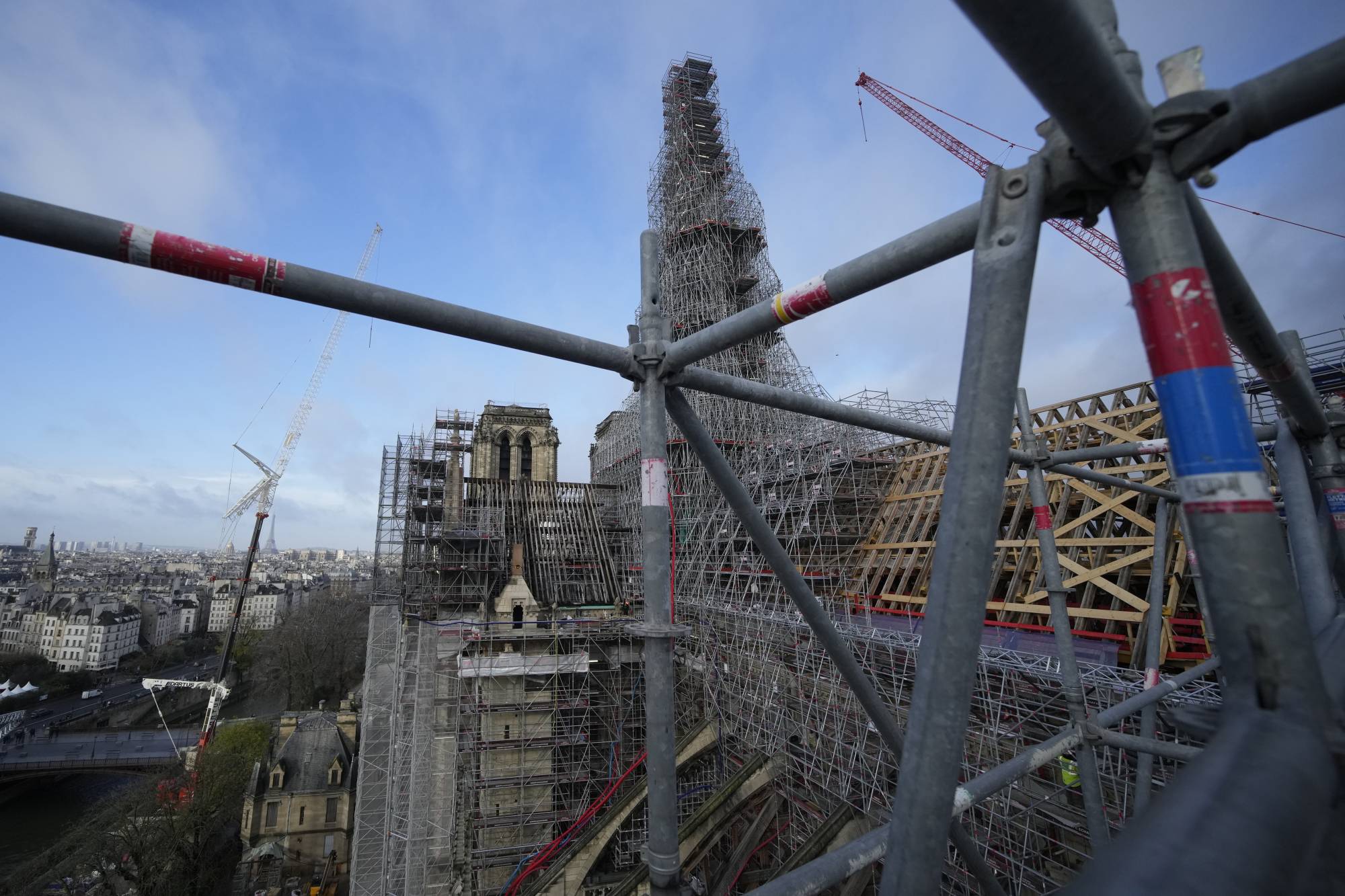 وظهر البرج، وفوقه الصليب مجدداً في 6 ديسمبر، على أعلى الكاتدرائية للمرة الأولى منذ الحريق، في حين لا يزال المَعْلم الباريسي الشهير مطوّقاً بالسقالات.