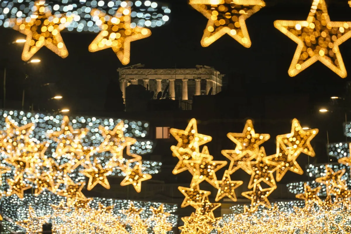 يظهر معبد البارثينون القديم المضاء في «الأكروبوليس» خلف سلاسل من أضواء العيد (أ.ب)