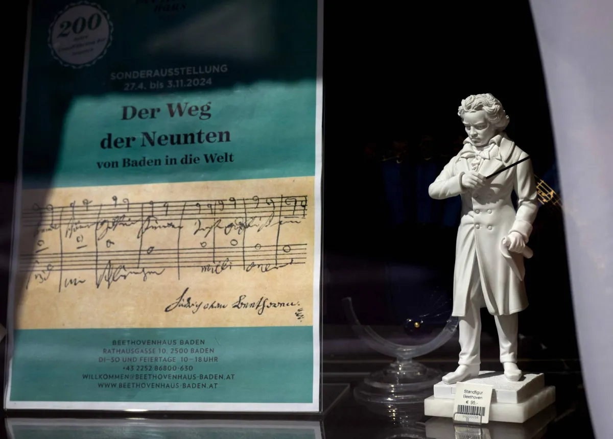 تمثال صغير للملحن الألماني بيتهوفن يظهر في متجر الهدايا التذكارية في فيينا (أ.ف.ب)