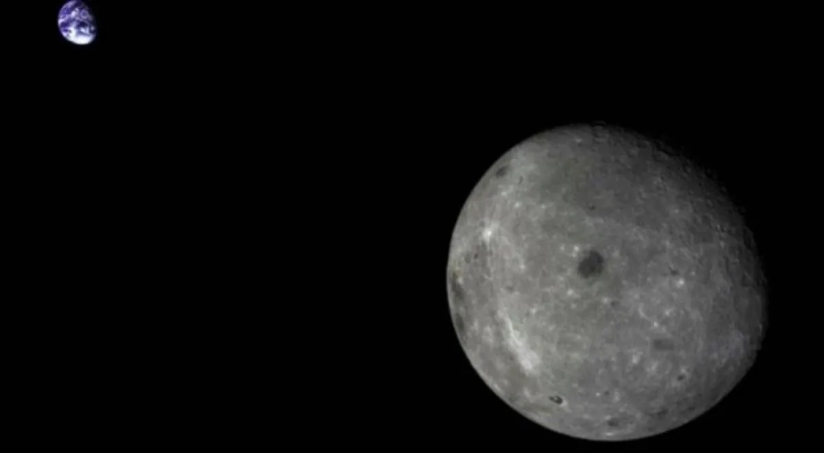 الجانب المخفي من القمر والأرض بعيدة كما جرى تصويره بواسطة مركبة فضائية صينية (الأكاديمية الصينية للعلوم)