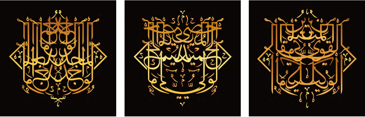 أما «نقوش مقدسة: أبعاد أسماء الله الحسنى»، فهي مجموعة من 33+1 عملاً فنياً، صُمِّمت كل قطعة منها بدقة لتعكس الجوهر الإلهي من خلال الخطّ العربي والأنماط الهندسية. وتقدّم رحلة تحويلية تتجاوز المادي وتلامس الروحي، وتقسم إلى 3 أقسام: الأزرق والذهبي والأخضر. وكل مجموعة تمثل أبعاداً روحية ورمزية مختلفة: الأزرق (11 عملاً فنياً) يرمز إلى الروحانية والسماء، ويُعدُّ مركزياً في الفن الإسلامي، إذ يمثل التأمل والتفكير. استخدامه في أرضيات وقباب المباني يمثّل عمق الكون والمعرفة العليا.