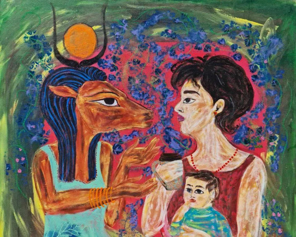 أما الموسيقى التي تُنسب كذلك لـ«حتحور»، فقد وجدت سبيلها إلى المتن التشكيلي للأعمال، عبر تشكيلات الراقصات التي ظهرت في بعض اللوحات لتمنحها بُعداً سينوغرافياً، يستفيد من عناصر اللوحة، ويضيف إليها، في حين يظهر الرقص في سياقات معاصرة ترتبط بالأمومة بتنويعاتها وهوامشها المختلفة، كما في لوحة تُهدهد فيها أم طفلها، وأخرى تتفقد أم ابنتها راقصة الباليه، وكأنهما في وضع تحليق.