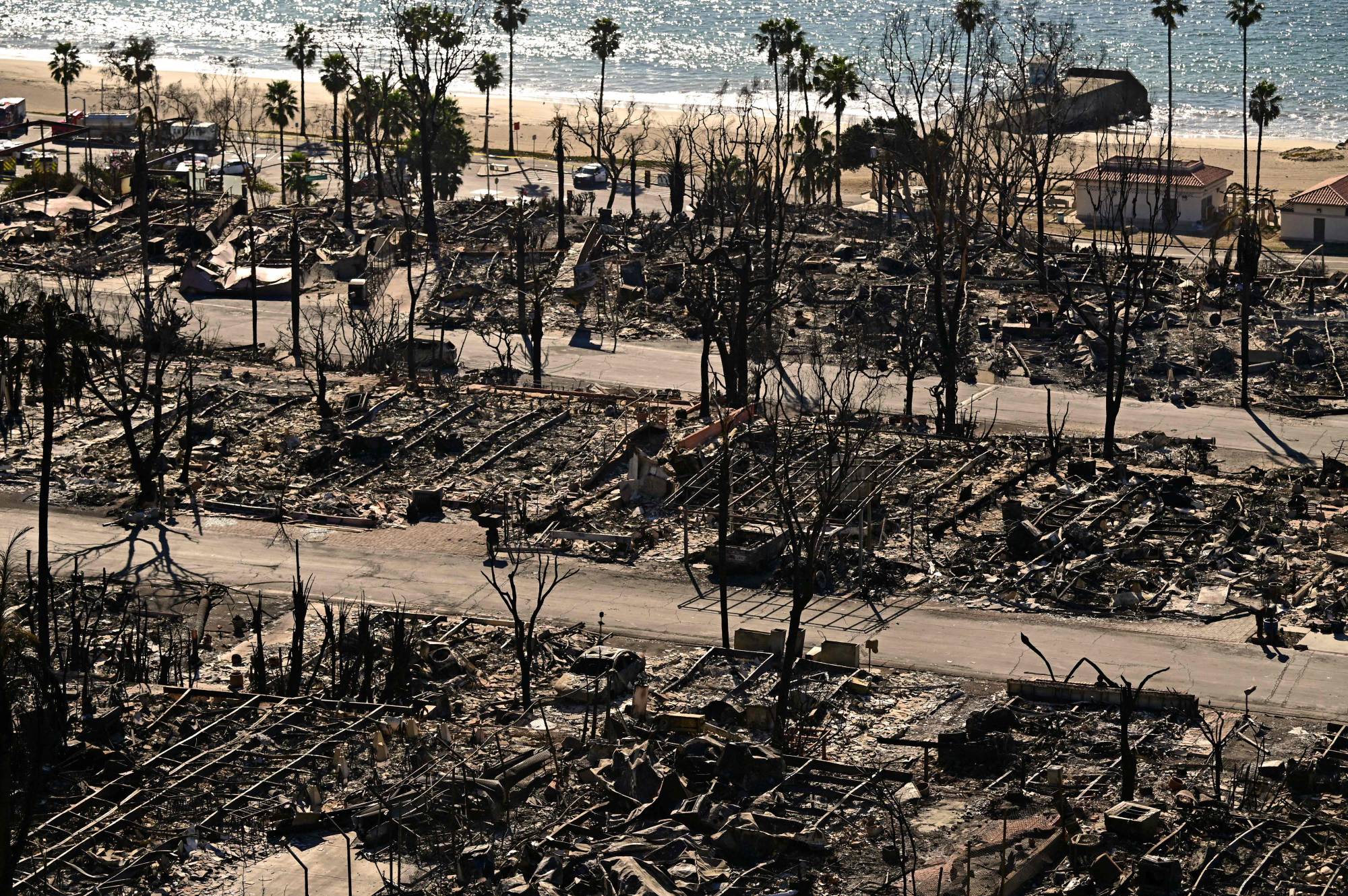 منازل متفحمة وسيارات محترقة وسط أنقاض مبنى سكن دمره الحريق في لوس أنجليس بكاليفورنيا (أ.ف.ب)