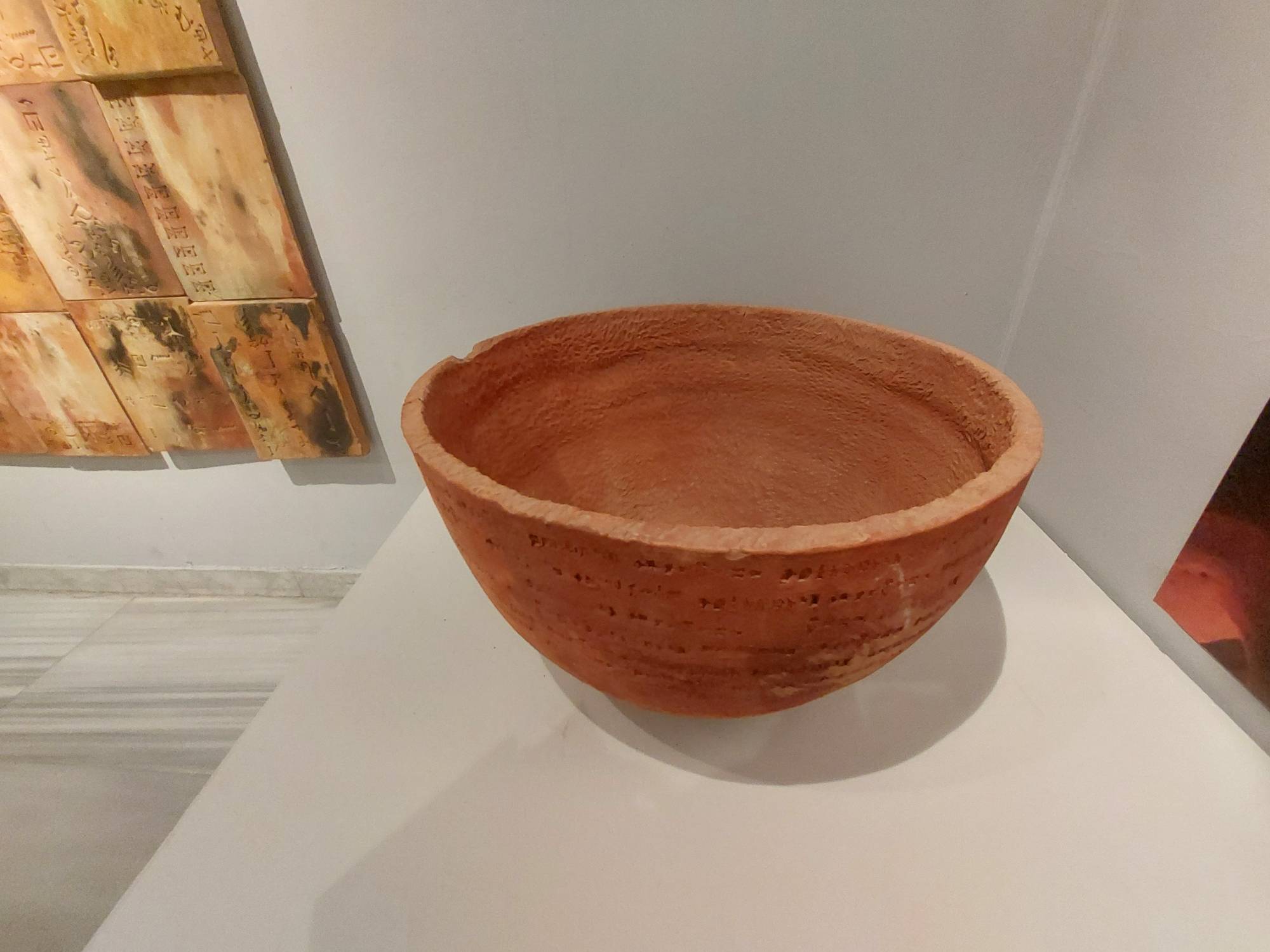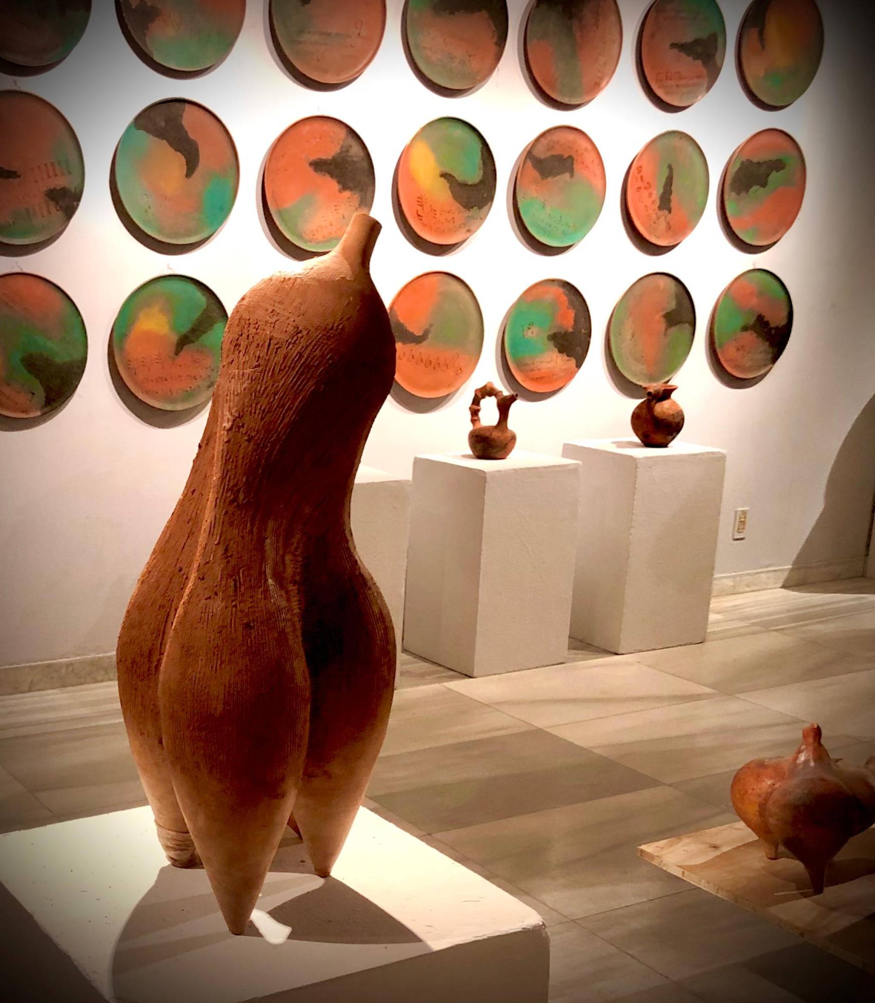 وتلفت الفنانة إلى أن هذه الأواني استوحتها من عصر ما قبل الأسرات، بعضها على شكل طائر أو حيوان مع بعض الكتابات «المسمارية الأرامية والساسانية»، التي لا ترمز لمعنى محدد، لكنها تعكس شكلاً جميلاً، حسبما تؤكد الفنانة.