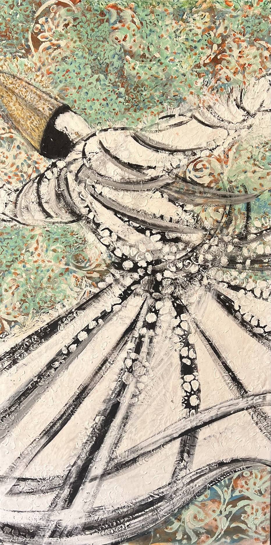 ومن خلال الأعمال يعيش المتلقي رحلة روحانية داخل عوالم الدراويش، خصوصاً مع دورانهم بملابسهم البيضاء الفضفاضة، وتطلُّع نفوسهم إلى السماء، بينما أجسادهم على الأرض في حركات منظَّمة ومنسَّقة، تتحدَّث عنها الفنانة لـ«الشرق الأوسط»، قائلة: «إن الحركة هي الحياة، ومن خلال أعمالي أريد أن يشعر المشاهد بهذه الحركة».