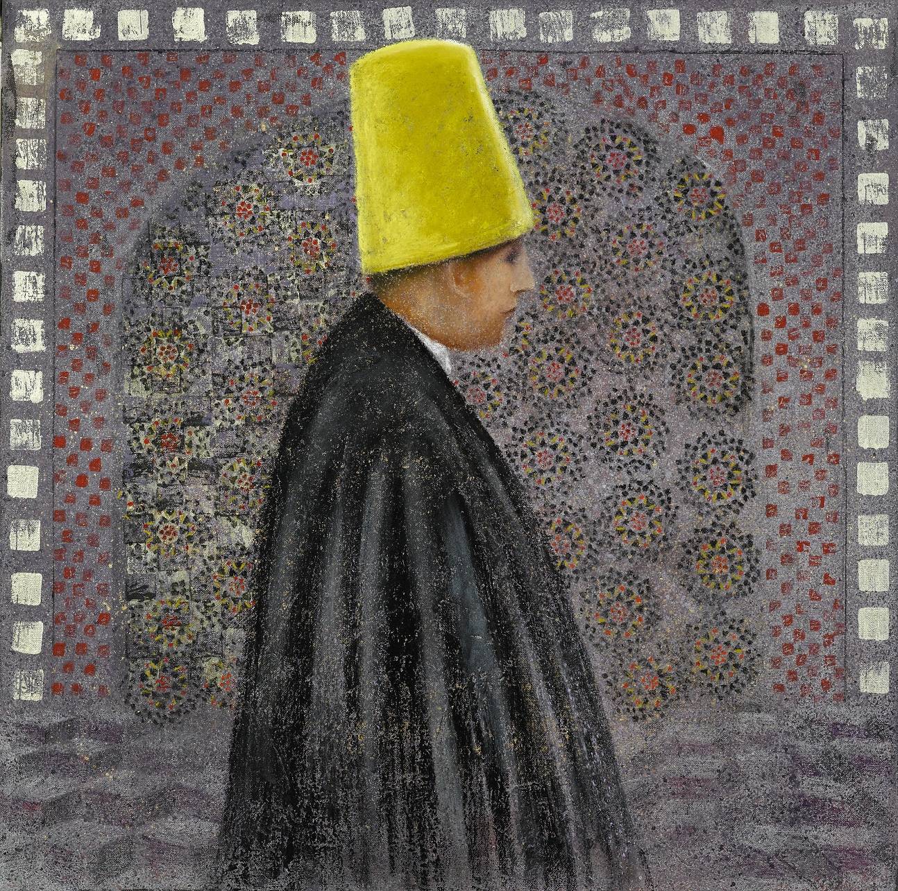 فيُطلُّ الدراويش علينا بثقة في حين تزخر خلفية اللوحات بالزَّخارف، مع احتفاء بالحواف أو الهوامش في محاكاة لعالم التَّصوف؛ حيث يسمح الرقص للدرويش بالانتقال من المركز إلى الهوامش، والتحليق في عالم التأمل.