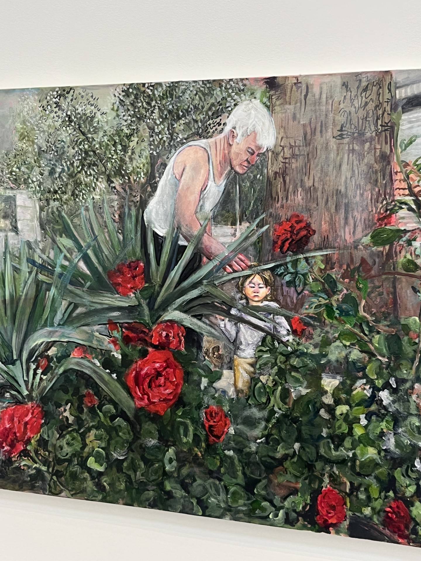 تكمل «الشرق الأوسط» جولتها مع الرسامة لتتوقف أمام لوحة زاهية بالأحمر والأخضر. تبادر بالقول: «إنها تمثّل جدّي أثناء عمله في الحديقة. وبين شتول الزهور تقف ابنتي بجواره».