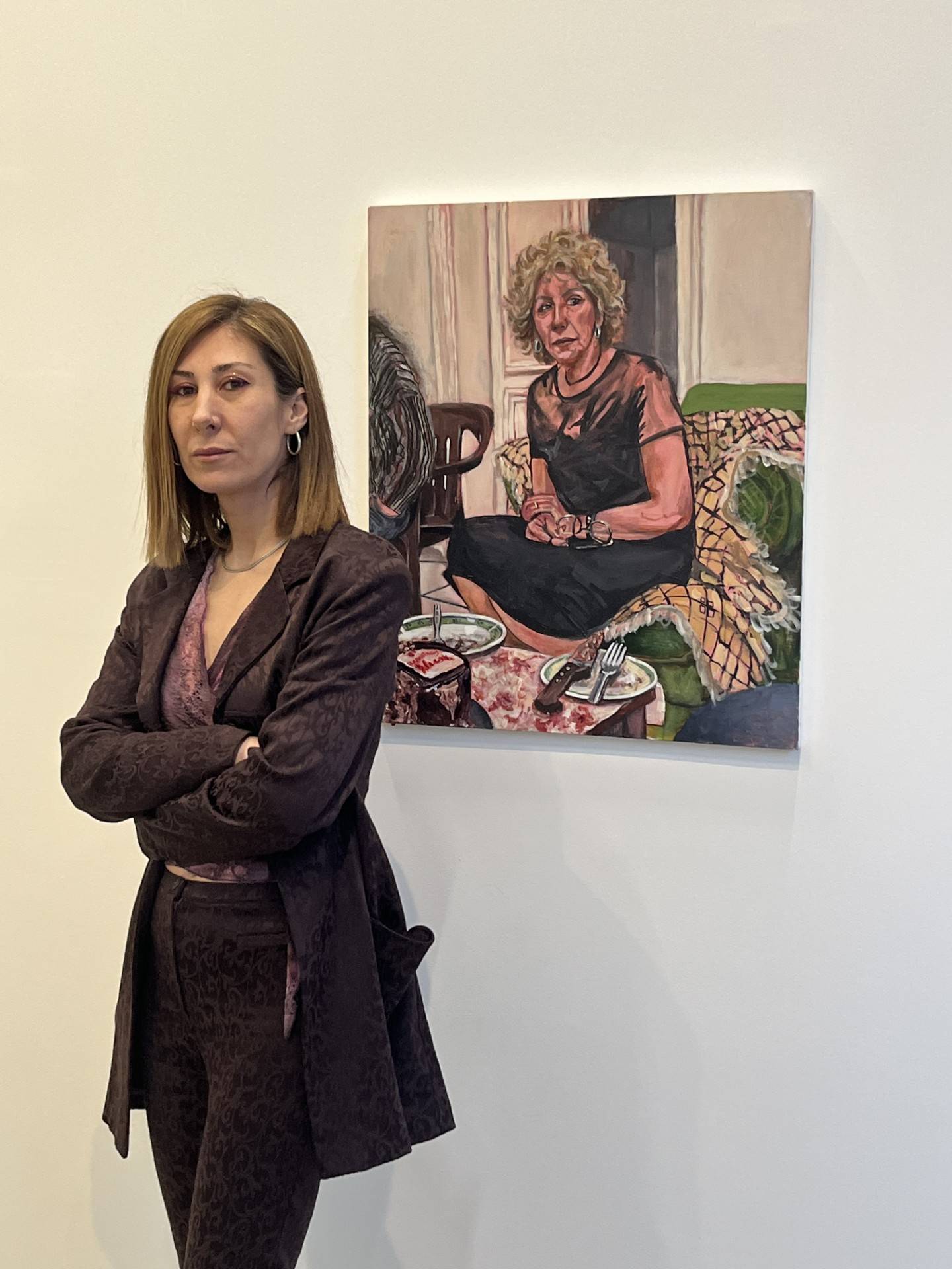 تُطالعك عند مدخل المعرض في غاليري «مرفأ» وسط بيروت، لوحة لسيدة تُوحي لك بالألفة. فهي تستريح على كنبة بكامل أناقتها أثناء استقبالها لزائريها. ونُدرك ذلك من خلال أطباق ترفع عليها الشوكة والسكين معلنة انتهاء الزيارة.