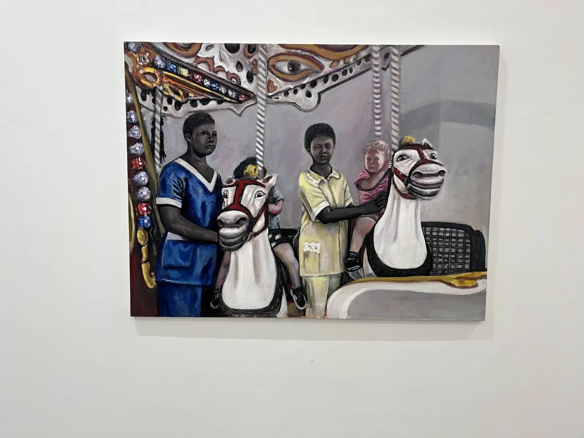 وفي صورة أخرى تأخذنا ميسم إلى مشاهد مشبّعة بالطفولة، فتلفتنا مدينة الملاهي حيث تركب فتاة صغيرة الحصان الكهربائي. وفي أخرى نُشاهد رجلاً يحضن طفلة رضيعة. «إنه شقيقي يحمل ابنتي عندما كانت طفلة. وهي اليوم كبرت وتركض بيننا في صالة المعرض. إنها ذكرياتي الخاصة، ونلاحظ فيها لعبة الضوء والعتمة بشكل لافت».