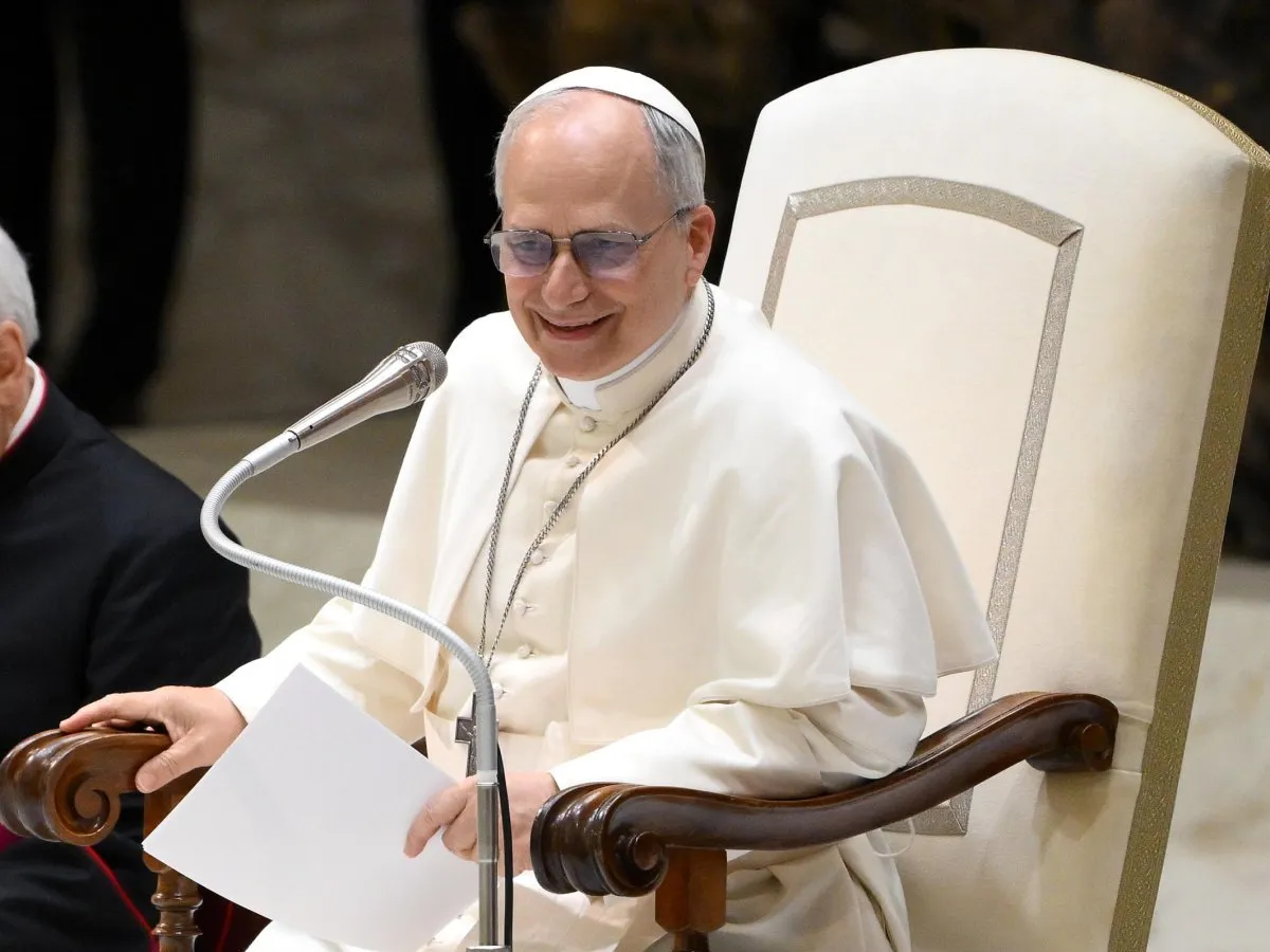 البابا ليو الرابع عشر خلال لقاء مع أعضاء وسائل الإعلام في الفاتيكان (إ.ب.أ)
