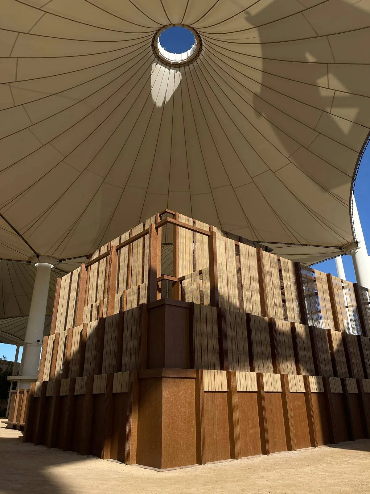 شكّل العمل الفائز بجائزة المصلى، من تصميم تحالف تقوده استوديو «إيست» للهندسة المعمارية، عنصراً محورياً في المساحة الخارجية للمعرض؛ حيث استُخدمت في بنائه بقايا أشجار النخيل المحلية، واستُلهم تصميمه من الفنون التقليدية لحياكة النسيج. وقد عُرضت أجزاء كاملة من هذا العمل في معرض بعنوان «عابر متجذّر»، أقيم بالتزامن مع الدورة التاسعة عشرة من المعرض الدولي للعمارة «بينالي البندقية»، ما أبرز مرونة التصميم، وقابليته للتفكيك وإعادة التركيب والاستخدام المتكرر.