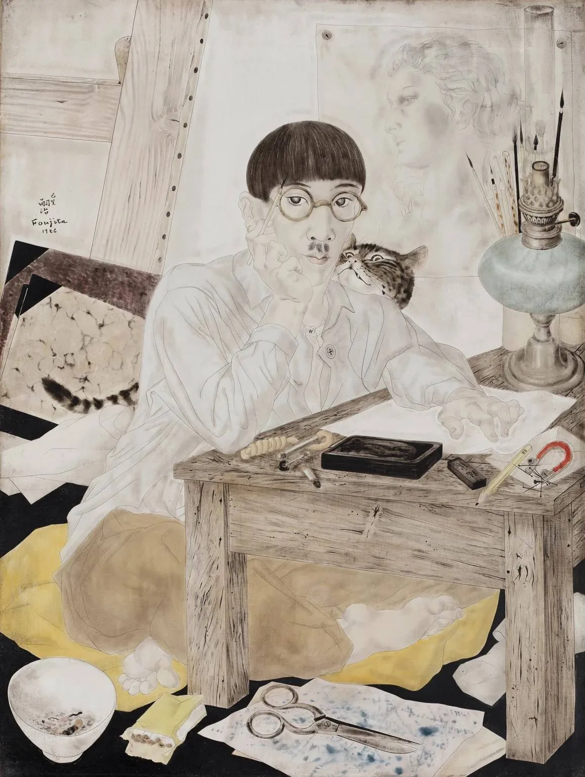 «صورة ذاتية مع قطة» لفوجيتا تسوغوهارو تمزج بين التأثيرات الغربية واليابانية (متحف سنغافورة الوطني)