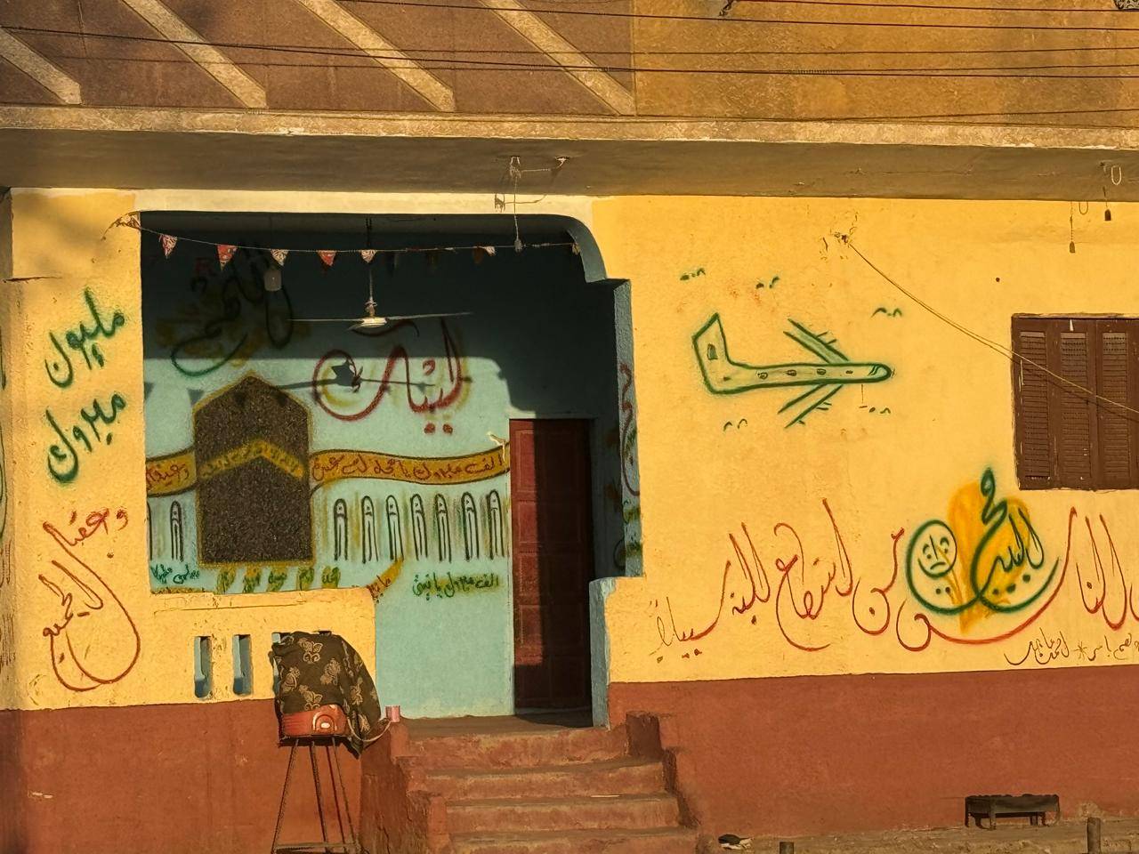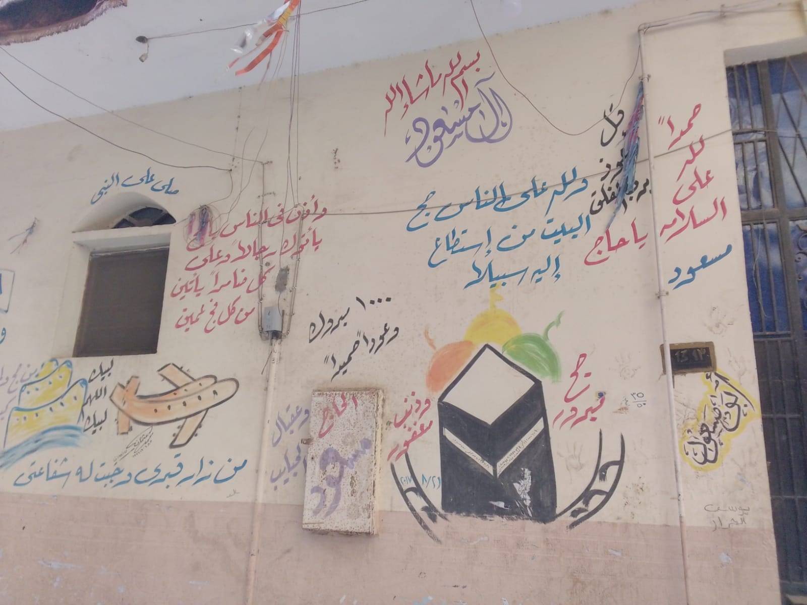 آيات قرآنية وصور للكعبة والطائرة ورسائل تهنئة على جدران أحد المنازل (الشرق الأوسط)