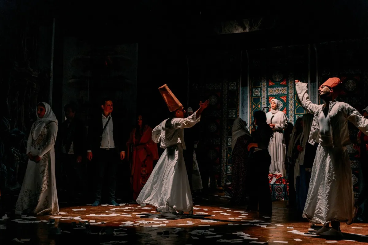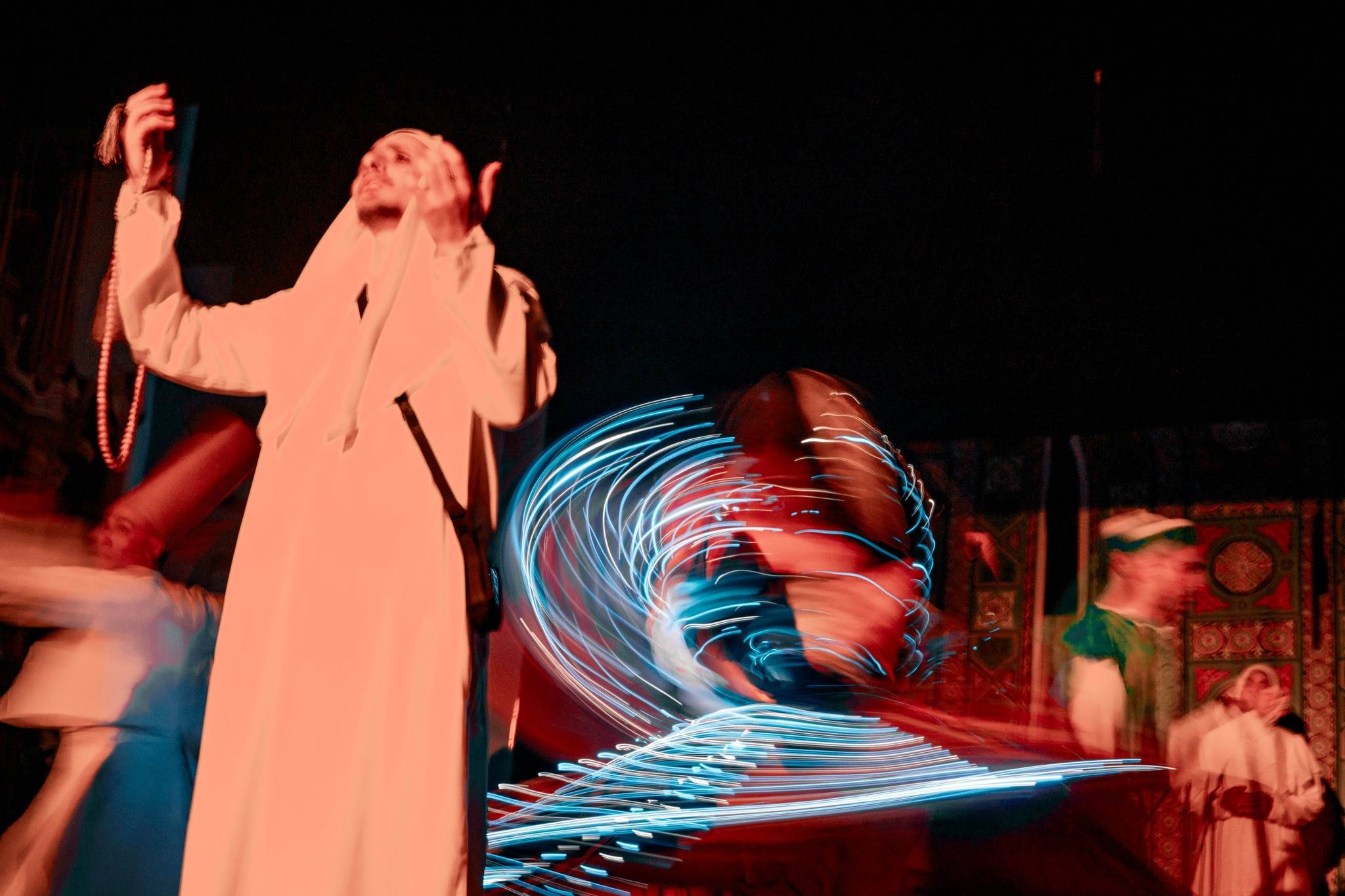 وجاءت سينوغرافيا العرض استلهاماً من أجواء خيام الموالد التقليدية، لكنها في الوقت نفسه مصممة بروح حداثية تعكس توتر الشخصيات والتحولات الدرامية؛ حيث تم فيها استخدام الإضاءة المتقطعة، والعناصر القابلة للحركة؛ لخلق فضاء حي ومتغير، كما أن المشهد المسرحي لم يكن مجرد خلفية، بل شريك أساسي في التعبير الدرامي، ساهم في صنع الإيقاع البصري والنفسي للعمل.