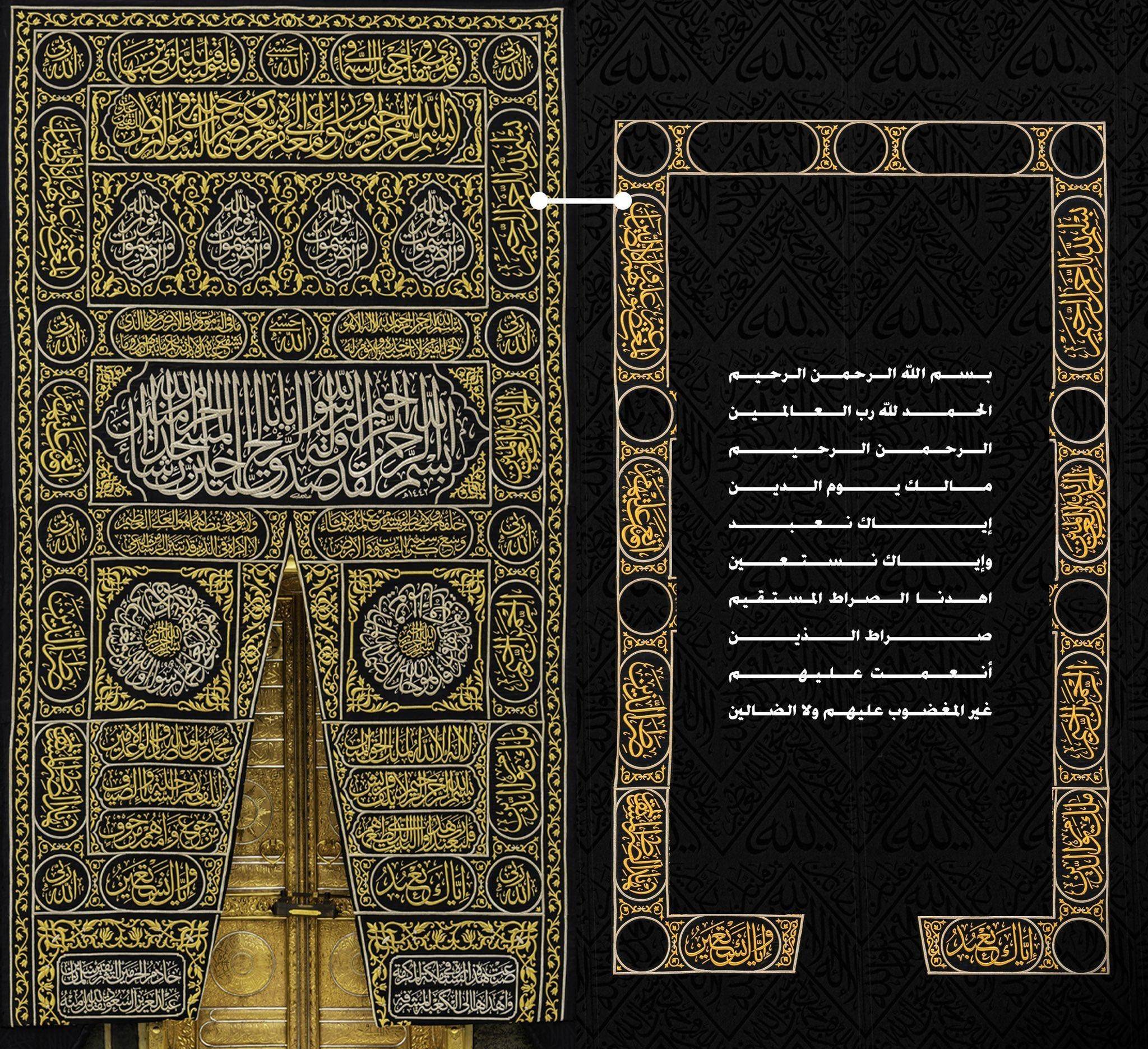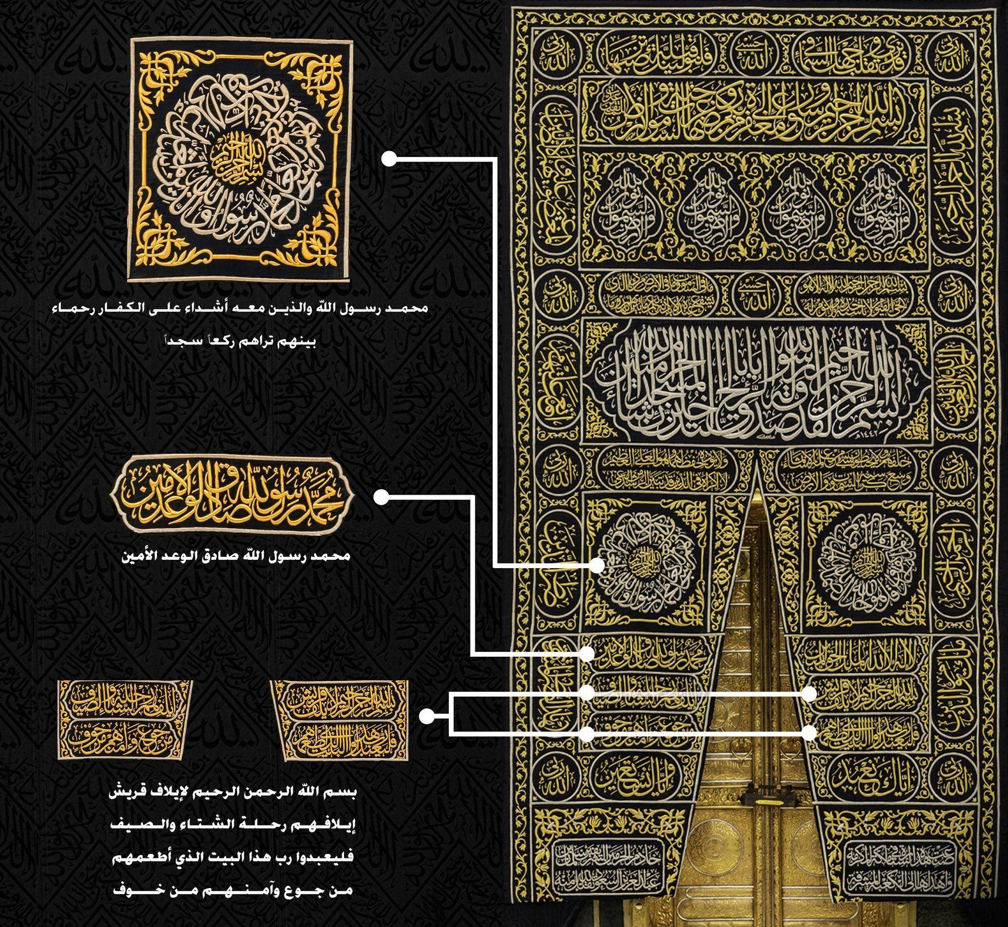 وتوجد تحت الحزام آيات قرآنية، كل منها مكتوبة داخل إطار منفصل، وفي الفواصل التي بينها يوجد شكل قنديل، مكتوب عليه «يا حي يا قيوم»، «يا رحمن يا رحيم»، «الحمد لله رب العالمين»، والحزام مطرز بتطريز بارز مغطى بسلك فضي مطلي بالذهب، يحيط بالكعبة المشرفة بكاملها، وتشتمل الكسوة على ستارة باب الكعبة، ويطلق عليها البرقع، وهي منسوجة من الحرير، مكتوب عليها آيات قرآنية ومزخرفة بزخارف إسلامية.