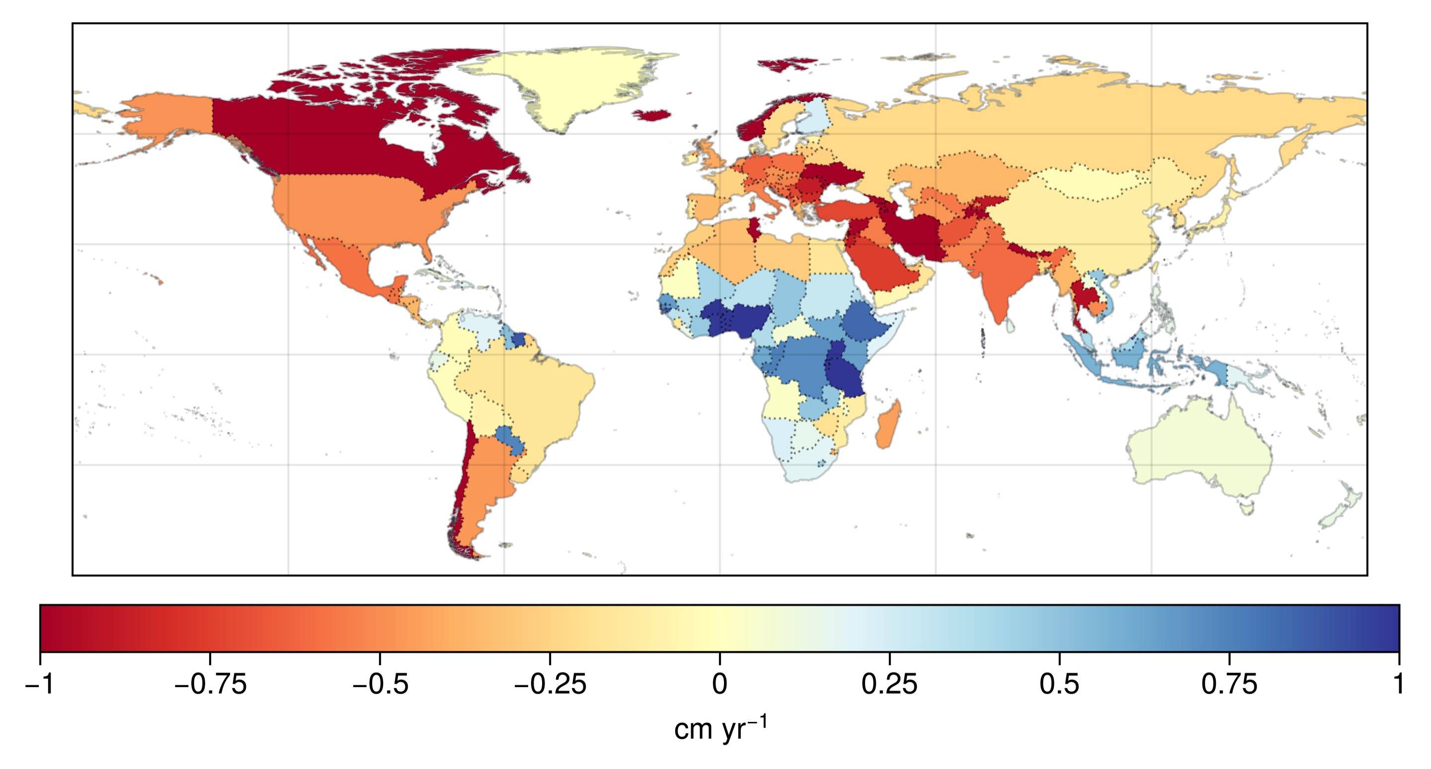 وحدَّدت الدراسة ما يبدو أنه نقطة تحوّل نحو عامَي 2014 و2015، خلال فترة تُعرف بـ«سنوات النينيو الكبرى». بدأت الظواهر المناخية المتطرّفة بالتسارع، ونتيجةً لذلك، ازداد استخدام المياه الجوفية، وتجاوز الجفاف القاري معدّلات ذوبان الأنهار الجليدية والصفائح الجليدية.