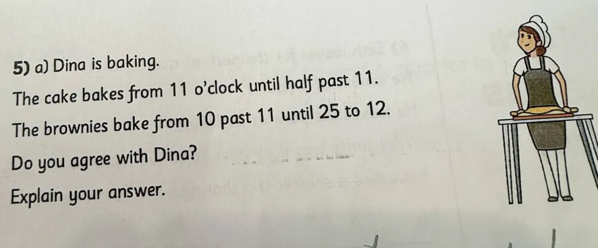 تنصّ المسألة على: «5أ) دينا تُخبز. تُخبز الكعكة من الساعة الحادية عشرة حتى الحادية عشرة والنصف. وتُخبز البراونيز من الساعة الحادية عشرة وعشر دقائق حتى الساعة الثانية عشرة إلا خمس وعشرين دقيقة. هل تتّفق مع دينا؟ اشرح إجابتك».