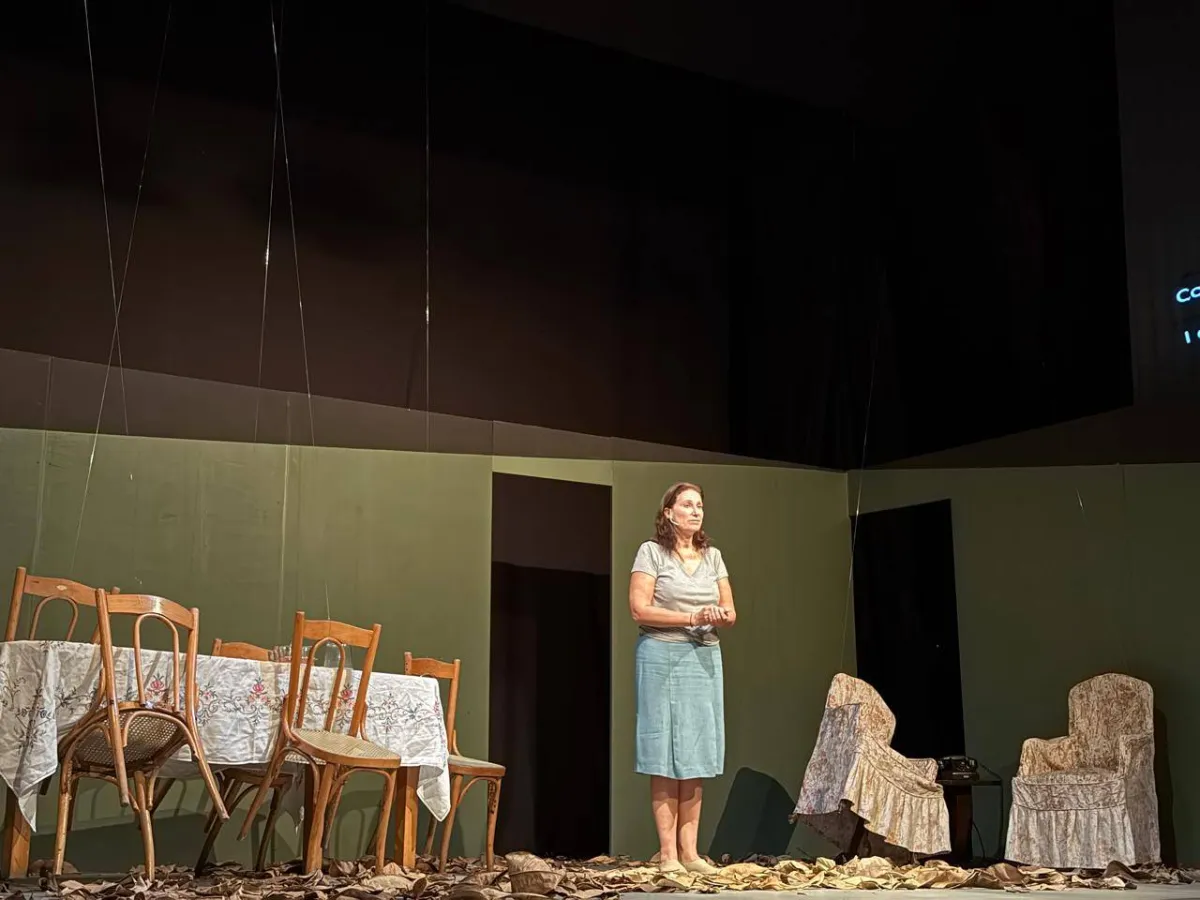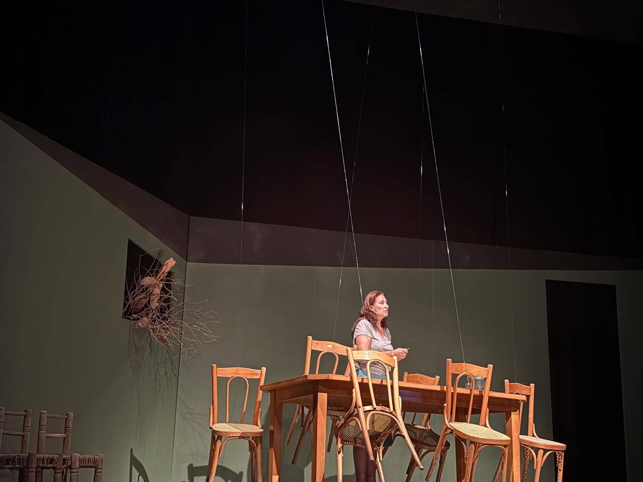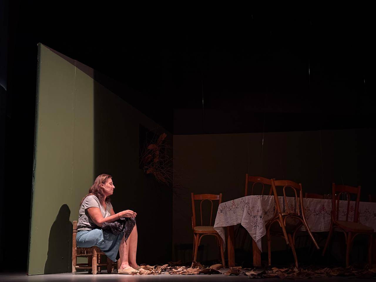 عدنان، الزوج الغائب، أدّى دوره إبراهيم خليل من وراء الستار، صوتاً بلا جسد وحضوراً عبر الغياب. اختارت لينا أبيض حصره في النبرة لتُكثّف الإحساس بالفقد. تميَّز إخراجها بقدرة واعية على تجنُّب الميلودراما، إذ اختارت الاقتصاد في الوسائل التعبيرية، فتركت للفراغات أن تتكلّم، وللصمت أن يُعلن ثقله، وللمكان أن يروي بعض الحكاية بالملامح والإيحاء: الكراسي المُعلّقة، الأرض المكسوَّة بأوراق ذابلة، المسافة الفاصلة بين وداد وصوت زوجها الغائب؛ كلّها عناصر جسَّدت غياباً أثقل من أيّ حضور. المسرح بدا مثل بيت مشقوق، نصفه قائم ونصفه منهار، كأنّ المُشاهد مدعوّ إلى العيش داخل ذاكرة متصدِّعة لا يمكن ترميمها.
