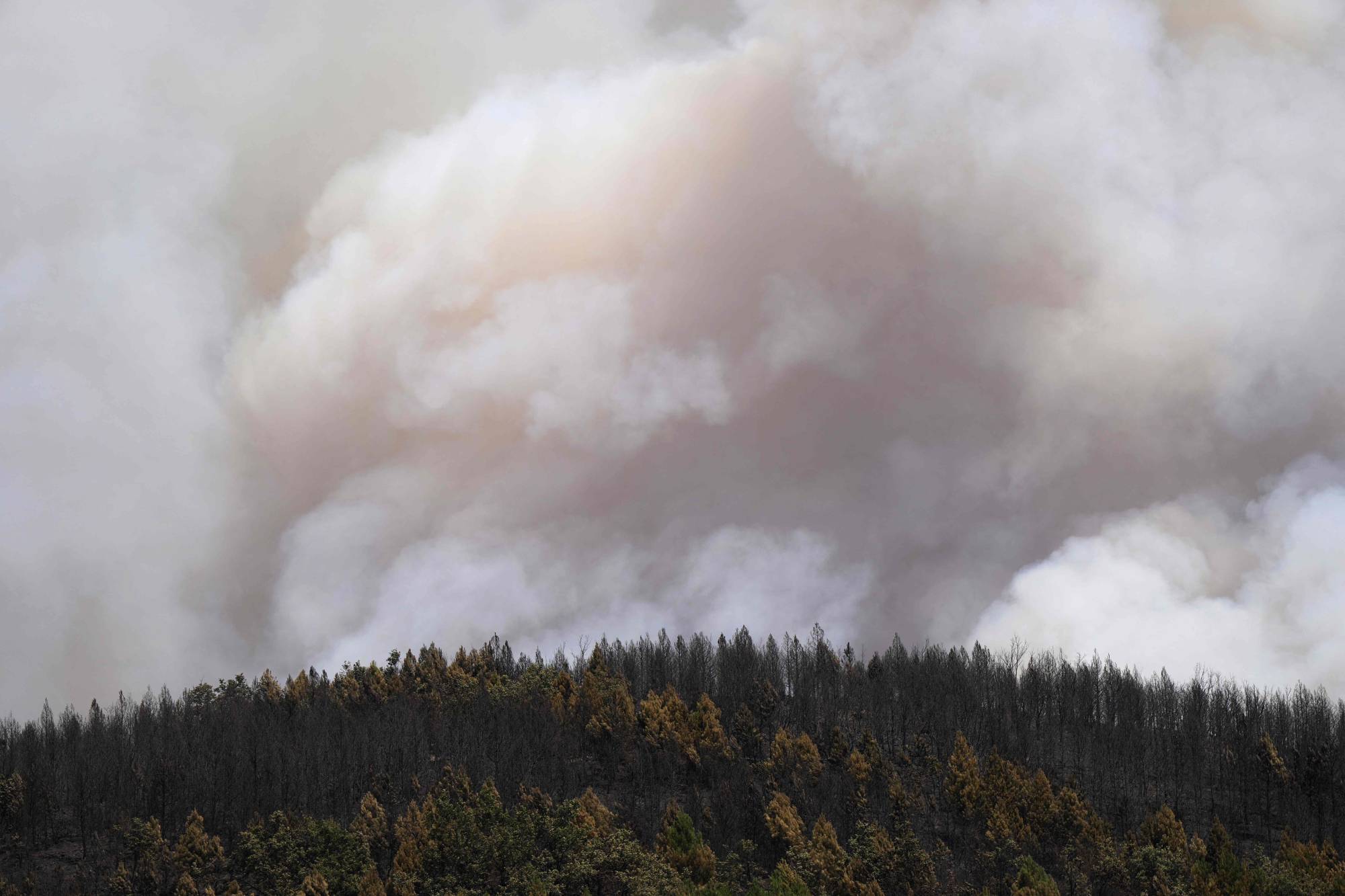 الدخان يتصاعد فوق غابة مشتعلة وسط حريق هائل في جارانو بالقرب من ليون بشمال غربي إسبانيا (أ.ف.ب)