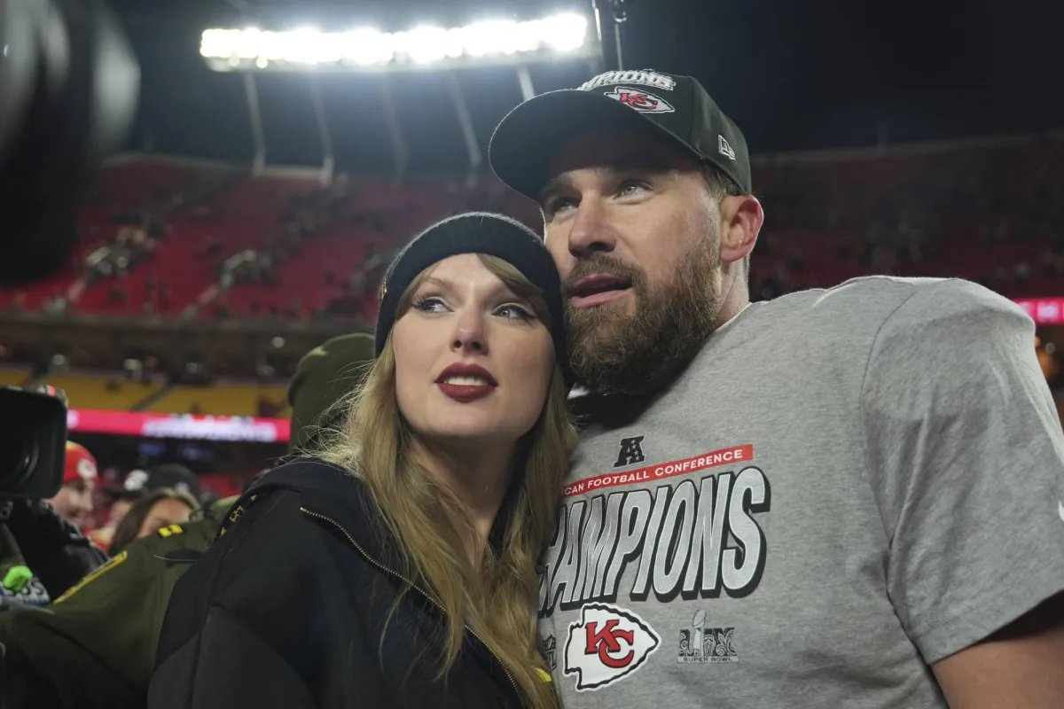 المغنية تيلور سويفت تظهر إلى جانب ترافيس كيلسي لاعب كرة القدم الأميركية (أ.ب)