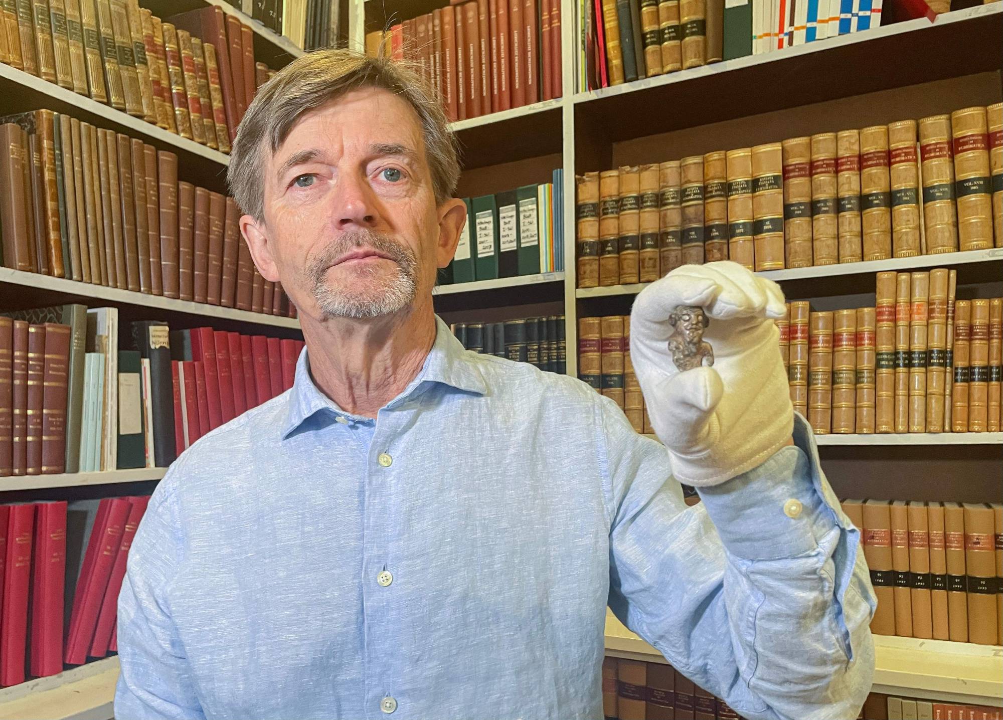 أمين المتحف بيتر بنتز يعرض التمثال المُكتشف (أ.ف.ب)