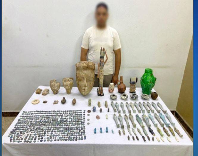 وبحسب تحريات قطاعي شرطة السياحة والآثار، والأمن العام، فقد تبين حيازة تاجر أدوات منزلية يقيم بمحافظة المنيا، لعدد من القطع الأثرية المتنوعة تمهيداً للاتجار بها. وعقب تقنين الإجراءات تم استهدافه وضبطه، ووجدوا بحوزته 577 قطعة يشتبه في أثريتها، وهي عبارة عن تماثيل وتمائم ورأس تمثال وأوانٍ وعملات معدنية ومجسمات من الفخار. وبعد عرض القطع المضبوطة على الجهات المختصة، أفادت بأن جميع القطع المضبوطة أثرية وتعود إلى العصور المصرية القديمة المختلفة. وبمواجهة حائز القطع اعترف بأن القطع ناتجة عن أعمال الحفر بإحدى المناطق الجبلية، كما اعترف بحيازتها بقصد الاتجار، وفق بيان لوزارة الداخلية المصرية، التي أعلنت اتخاذ الإجراءات القانونية حيال الواقعة.