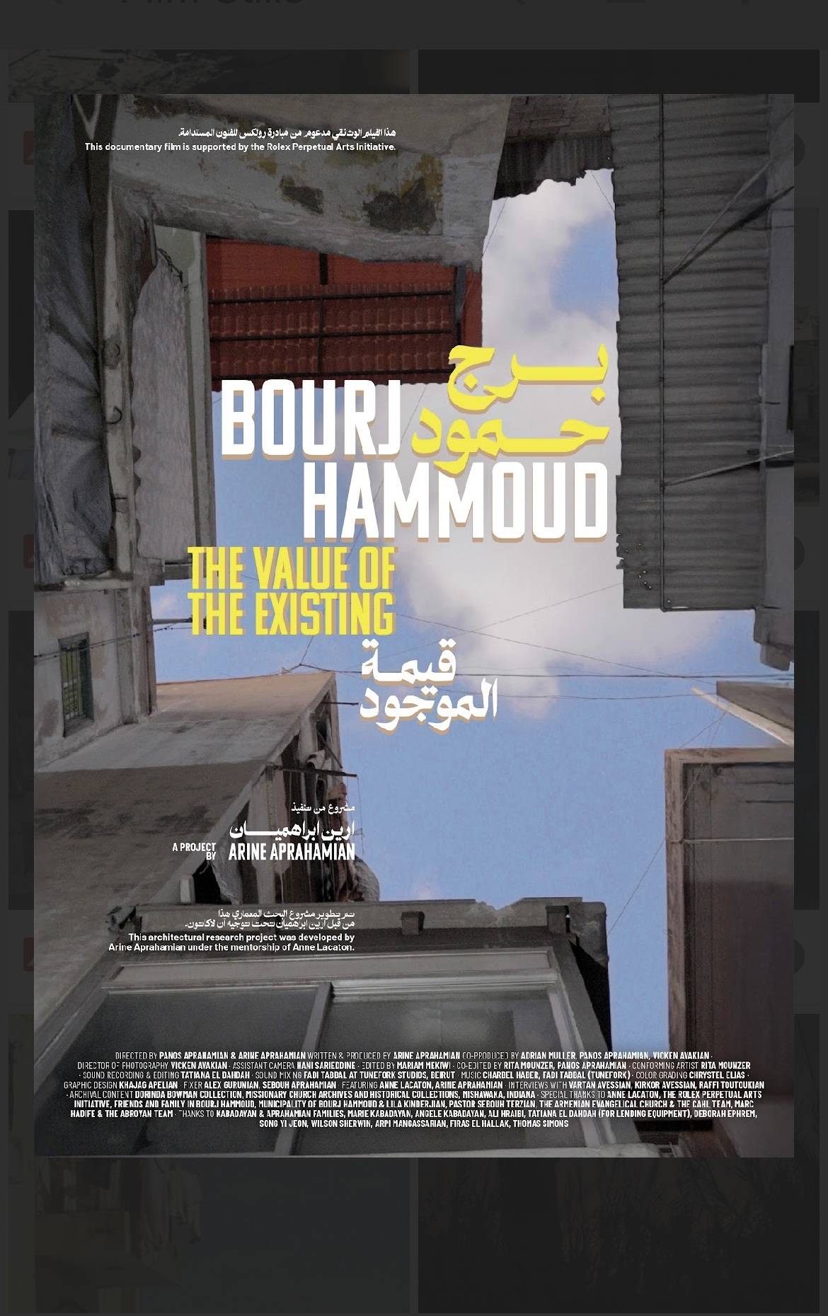 ومن الأفلام اللبنانية التي تتناول البيئة فيلم «برج حمود: قيمة الموجود»، وهو وثائقي يتتبع مشروع بحث معماري امتد لعامين في أحد أكثر أحياء بيروت كثافة وتشابكاً سكانياً، من إخراج أرين وبانوس أبراهميان.