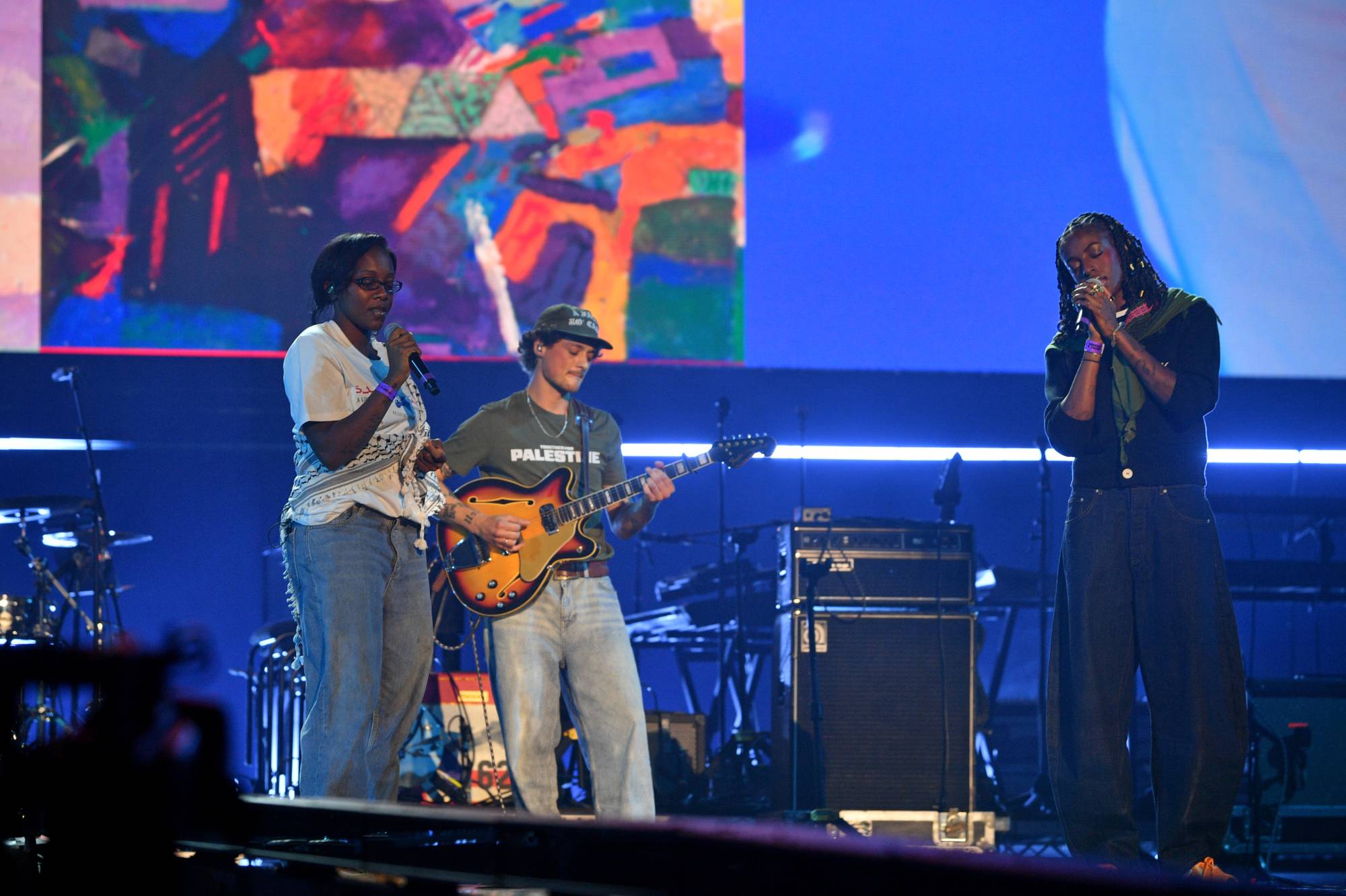 طيلة الحفل، تحوّل المسرح متحفاً حيّاً للتاريخ والواقع الفلسطينيين، وذلك عبر سلسلة من اللوحات التشكيليّة، حديثة ومعاصرة، عُرضت على شاشة عملاقة خلف الفنانين. أكثر من اثني عشر رساماً ورسامة من مختلف مراحل التاريخ الحديث، جمعتهم المديرة الفنّية للحدث ملاك مطر. وهي رسامة غادرت غزة في السادس من أكتوبر (تشرين الأول) 2023 للدراسة في لندن. بعض الرسامين الذين عرضت أعمالهم كانوا قد قتلوا جراء الحرب الأخيرة على فلسطين، فتردّدت كلمات الشاعر الفلسطيني رفعت العرعير — الذي درس في جامعة لندن (UCL) قبل أن يعود إلى غزة حيث قُتل في غارة إسرائيلية في ديسمبر (كانون الأول) 2023 — «إنْ كان لا بد أن أموت، فعليك أن تحيا، لكي تروي حكايتي (...) إنْ كان لا بد أن أموت، فليكن موتي أملاً، فليكن حكايةً تُروى».