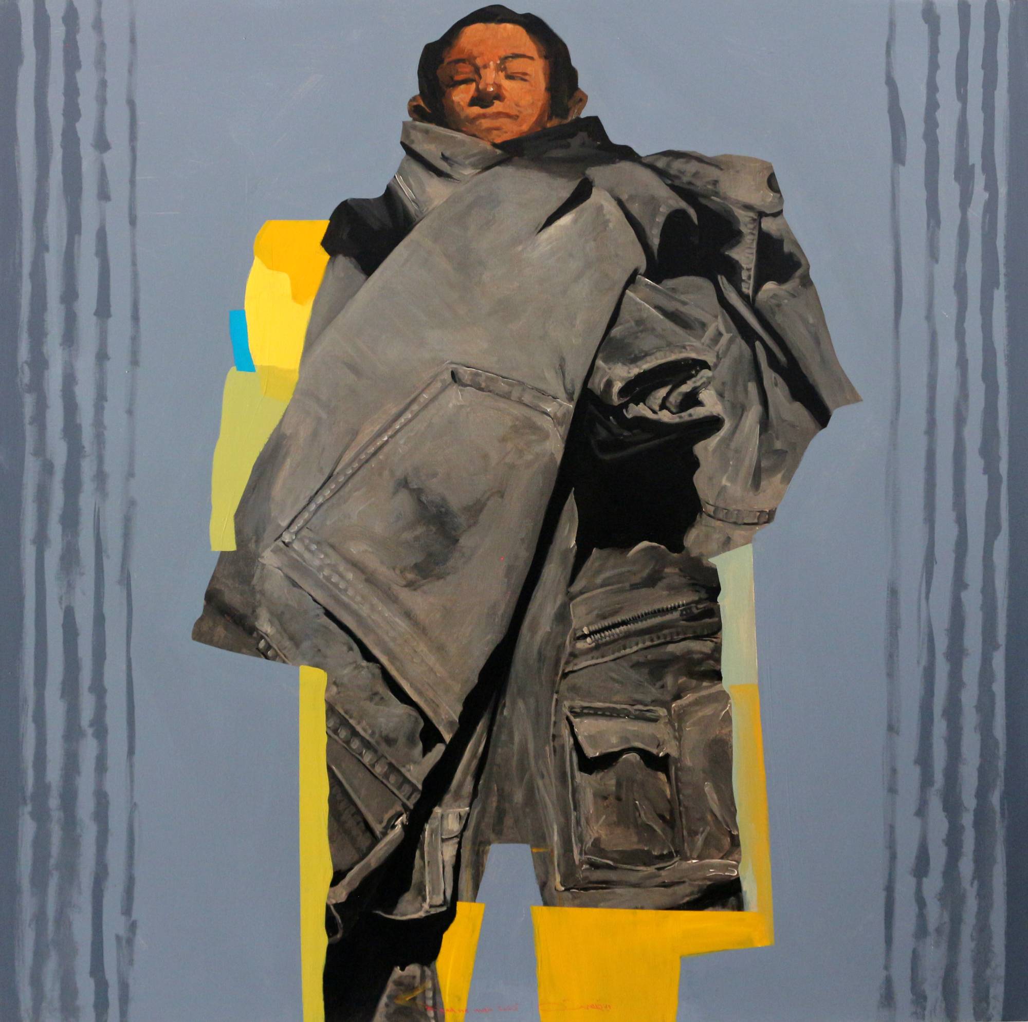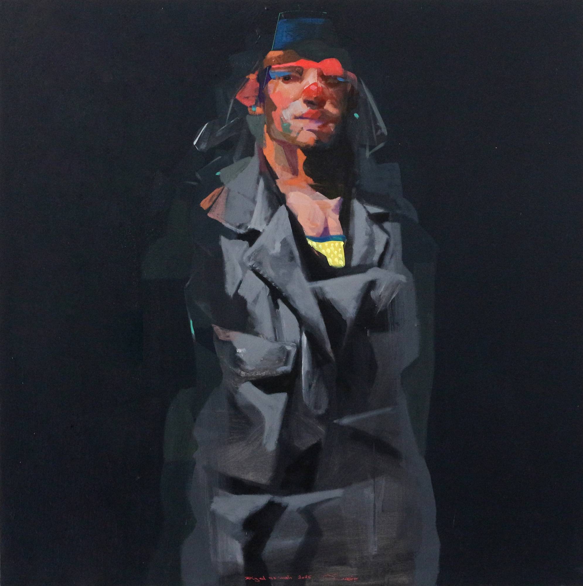 وبالفعل، تبدو شخصيات رياض نعمة كأنها مُعلَّقة بين الطفولة والرشد، وبين الجسد الضيّق والسترة المُتضخّمة. وجوهٌ نصف مطموسة، أحياناً داكنة كأنها خارجة من الظلمات، وأجساد محشورة في معاطف واسعة تتحوَّل إلى قوقعة أو سجن. الشخصيات لا تحتمل المقاس الذي أُلبِسَت إياه، فتبدو كأنها تقول إنّ الواقع أكبر من قدرتها، ومع ذلك فهي واقفة، شاهقة، تُعلن أنّ المهانة لا تلغي الكرامة. في هذه اللوحات، يمتزج ثقل السترة التي ترمز إلى السلطة والعبء الاجتماعي مع ملامح الوجه التي تستبطن ارتباك الإنسان، ليصير الجسد نفسه استعارة عن السياسة والطفولة المقهورة.