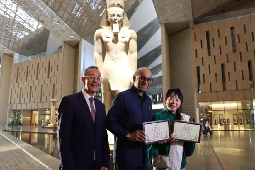 واستقبل المتحف المصري الكبير ومنطقة أهرامات الجيزة، رئيس جمهورية سنغافورة وزوجته والوفد المرافق لهما، حيث كان في استقبالهم بالمتحف الدكتور أحمد غنيم، الرئيس التنفيذي لهيئة المتحف، الذي رحب بهم وأهداهم نسخة مصغرة من قناع الملك توت عنخ آمون، وفق بيان الوزارة.