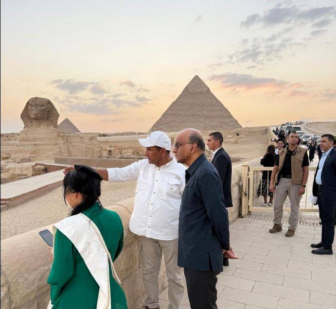 كما توجه رئيس سنغافورة والوفد المرافق إلى منطقة أهرامات الجيزة، حيث كان في استقبالهم الدكتور أشرف محيي الدين، مدير عام آثار الجيزة، الذي اصطحبهم في جولة شملت الهرم الأكبر، مستعرضاً تاريخه وعدد أحجاره، بالإضافة إلى زيارة تمثال أبو الهول مع تقديم شرح حول تاريخه وطريقة نحته، وجولة في منطقة البانوراما للتعريف بأهم معالم المنطقة الأثرية.