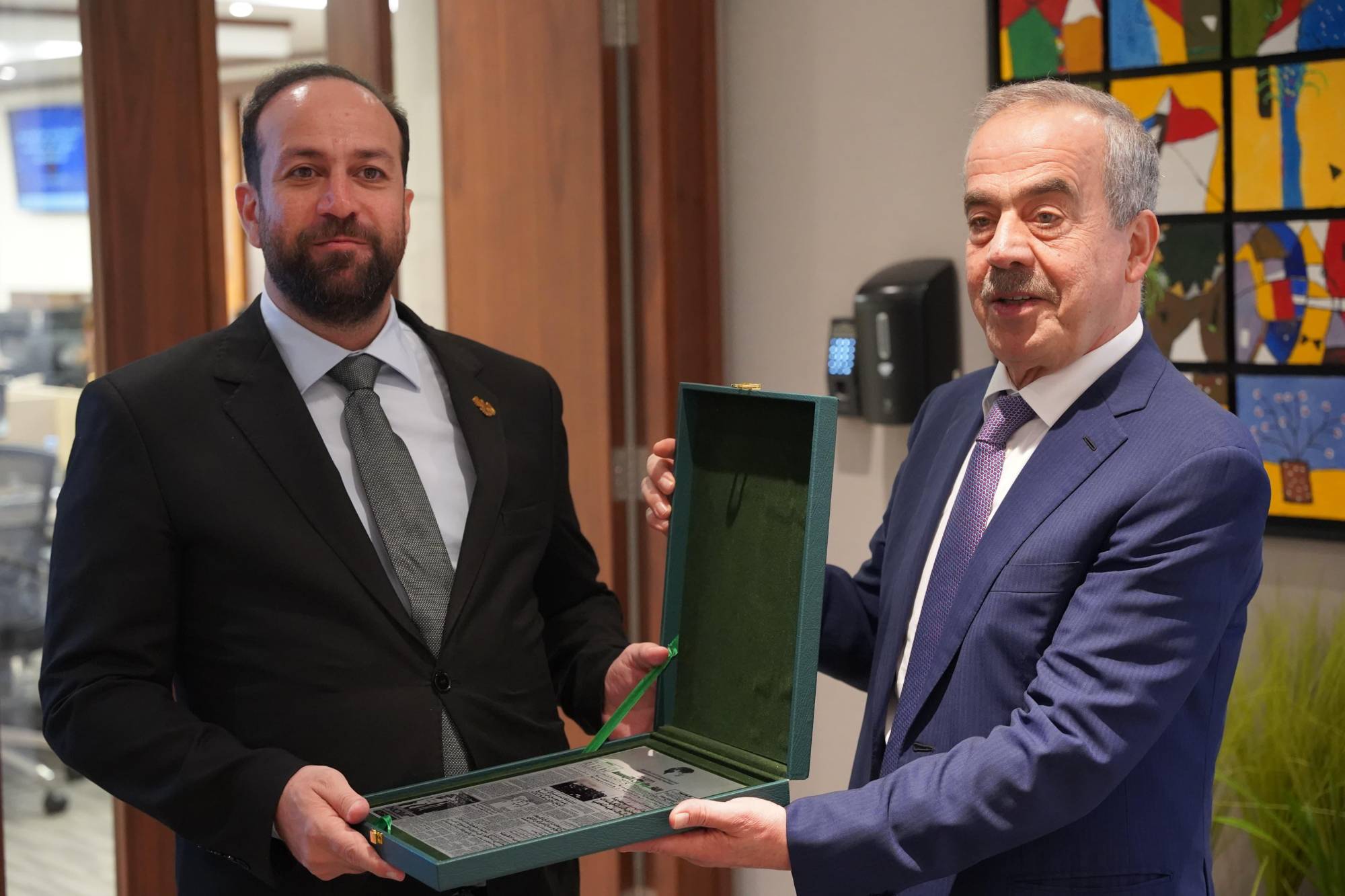 رئيس تحرير «الشرق الأوسط» غسان شربل يسلم وزير الإعلام السوري حمزة المصطفى درعاً تذكارية (SRMG)