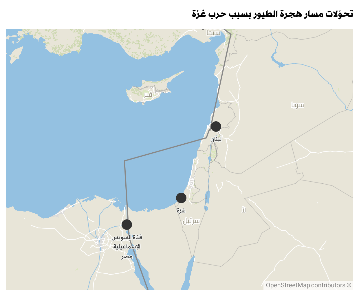 وتُعدّ الحروب سبباً أساسياً في تغيير الطيور مسار هجرتها الموسمية. ومنذ اندلاع الحرب الإسرائيلية على غزة، وهي تحيد عن سماء فلسطين المشتعلة وموائلها المدمّرة لتسلك مساراً أكثر أماناً هو خليج السويس، وصولاً إلى مصر ومنها إلى أفريقيا. فأولوية الطير المهاجر هي إيجاد مسار آمن لهجرته، بما في ذلك من استراحات يتوافر فيها الغذاء والماء. أما الشرود عن المسار الآمن لأسباب خارجة عن إرادته كما الحرب، فيقلّل من فرص وصول الطير سالماً.