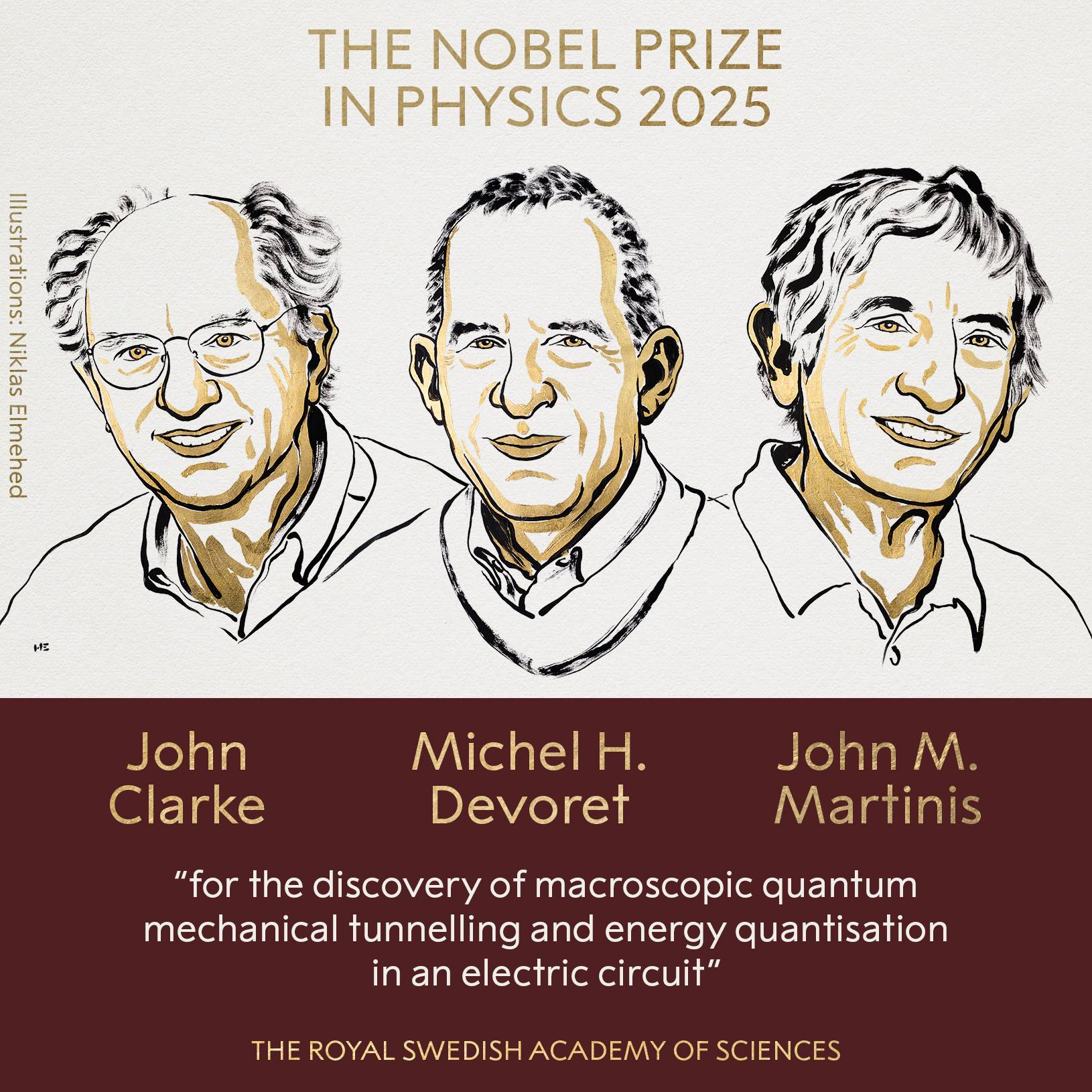 منحت الأكاديمية الملكية السويدية للعلوم، الثلاثاء، البريطاني جون كلارك، والفرنسي ميشال ديفوريه، والأميركي جون مارتينيز جائزة «نوبل في الفيزياء» لعام 2025، وذلك تقديراً لتجاربهم التي كشفت عن تطبيقات جديدة في فيزياء الكمّ.