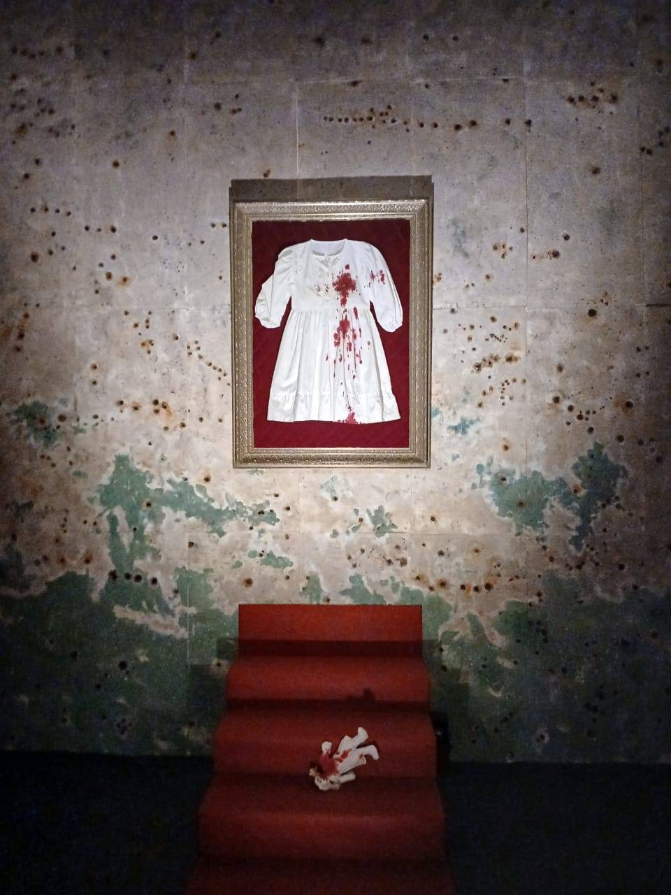 هذا العمل يقود الزائر في مسار بصري يتتبّع فراشات مُجسّمة على الجدران، قبل أن يُفاجأ بمشهد صادم: فستان طفلة ودُمية ملطّخان بالدماء، على وَقْع طلقات رصاص تتردَّد في القاعة، فتتحوَّل الفراشات إلى رمز لأحلام الطفولة التي تُجهض في عالم تحكمه الحروب والصراعات والنزوع إلى التخريب وإراقة الدماء.