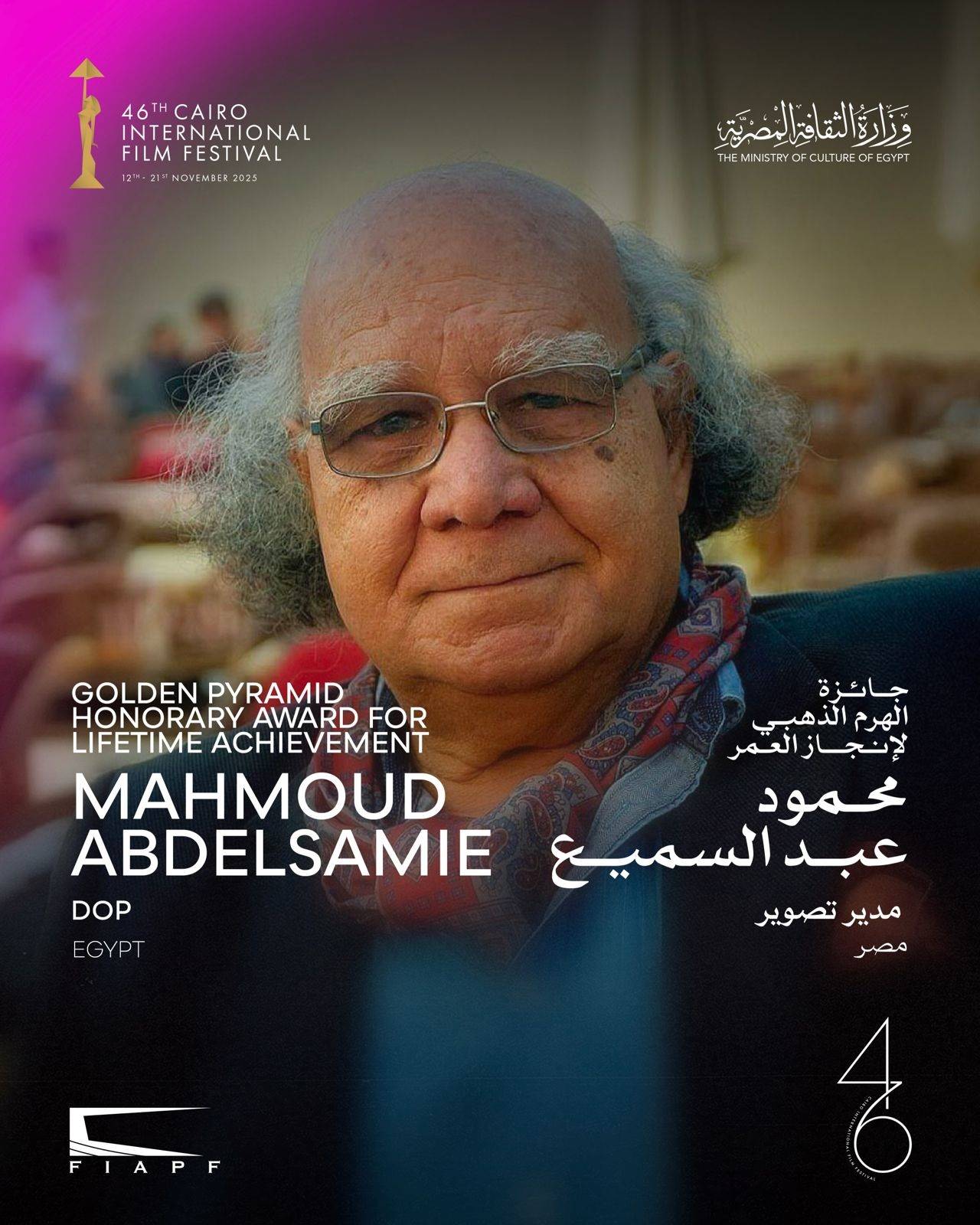 أعلن مهرجان القاهرة السينمائي عن تكريم الفنانة الفلسطينية هيام عباس ومنحها جائزة «الهرم الذهبي» تقديراً لجهودها في إضاءة القضايا الإنسانية والاجتماعية عبر مسيرة فنية عالمية شاركت خلالها في أعمال كبرى على غرار «ميونيخ»، و«Succession»، وقد ظلت صوتاً معبراً عن قضية الشعب الفلسطيني، كما كشف عن تكريم المخرجة المجرية إلديكو إنيدي ومنحها أيضاً «الهرم الذهبي» تقديراً لمسيرتها الفنية التي تميزت بحس إنساني عميق وحصولها على جوائز مهمة مثل «الكاميرا الذهبية» و«الدب الذهبي».