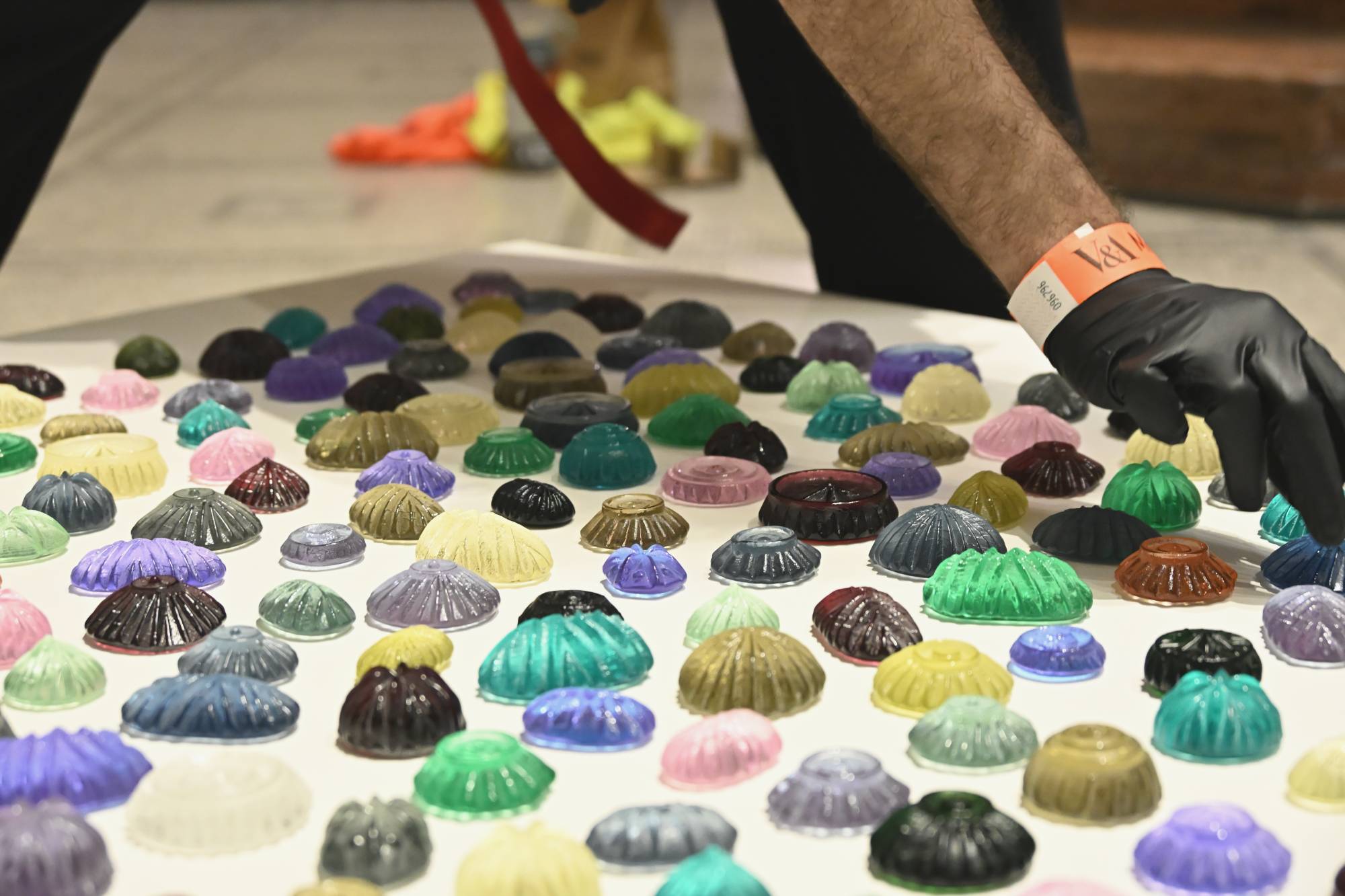 تلفتنا بشدة فكرة استخدام الزجاج لصنع حبات المعمول الملونة، فالزجاج يرتبط مباشرة بالانفجار الذي خلف دماراً هائلاً كان الزجاج المهشم أبرز علاماته. يقول الفنان إن الزجاج المهشم أصبح «سمفونية المدينة» بعد الانفجار، واصفاً صوت المشي عليه في أثناء عمليات التنظيف، «أتذكر أنه أصبح صوتاً يدل على هذا الانفجار المحدد. لأن الزجاج كان في المادة التي تحطمت أكثر، بسبب شدة الانفجار الفعلية، وليس المنازل التي انهارت، مع أن بعضها قد انهار. وهي المادة التي تسببت في إصابات معظم الناس أيضاً. لذلك شعرت بأنه من المناسب دمج ذلك في العمل كأنه علامة مباشرة على هذا الحدث المحدد، وفي الوقت نفسه، يتمتع الزجاج بهذه القدرة على إعادة التشكل بطريقة لا نهائية». لكل هذه الدلائل أصبح الزجاج رمزاً ووسيلة لإنجاز هذا العمل يضيف إليها الفنان أنه يمكن رؤية أشكال المعمول الزجاجية بأنها تعبر عن الهشاشة والعنف «وهما جانبان مما مررنا به في الانفجار. كنا نشعر بالمأساة، وأصبح الزجاج مادةً صادمةً للجميع. لم يستطع الناس الجلوس بجانب النوافذ لشهور خوفاً من أن يتحطم الزجاج مجدداً ويؤذي الجميع. أصبح التفاعل مع الزجاج مرة أخرى بمكانة رد فعلٍ قويٍّ من الصدمة».